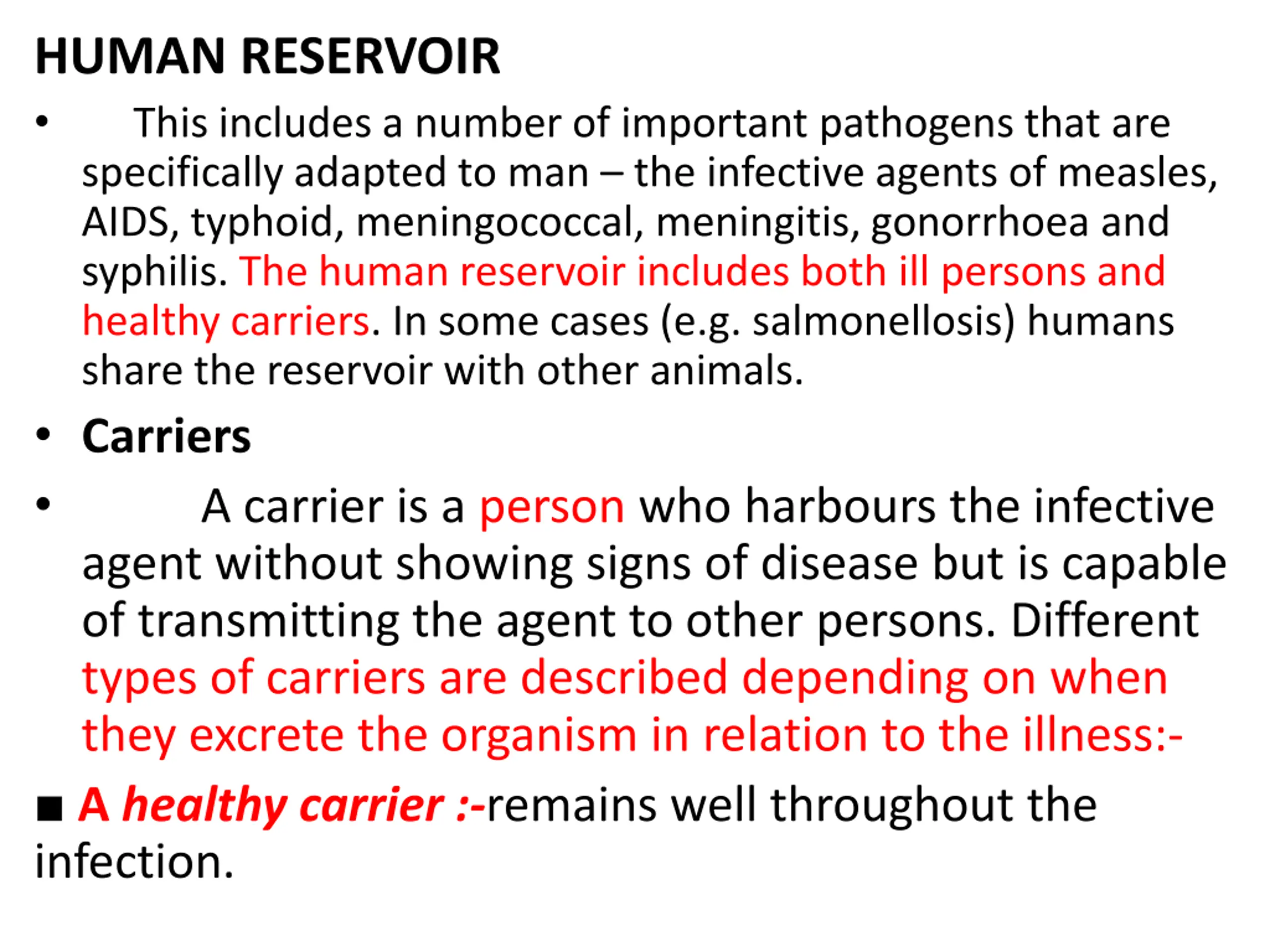 HUMAN RESERVOIR This includes a number of important pathogens that are specifically adapted to man the infective agents of measles, AIDS, typhoid, meningococcal, meningitis, gonorrhoea and syphilis. The human reservoir includes both ill persons and healthy carriers. In some cases (e.g. salmonellosis) humans share the reservoir with other animals. Carriers A carrier is a person who harbours the infective agent without showing signs of disease but is capable of transmitting the agent to other persons. Different types of carriers are described depending on when they excrete the organism in relation to the illness:- A healthy carrier :-remains well throughout the infection.