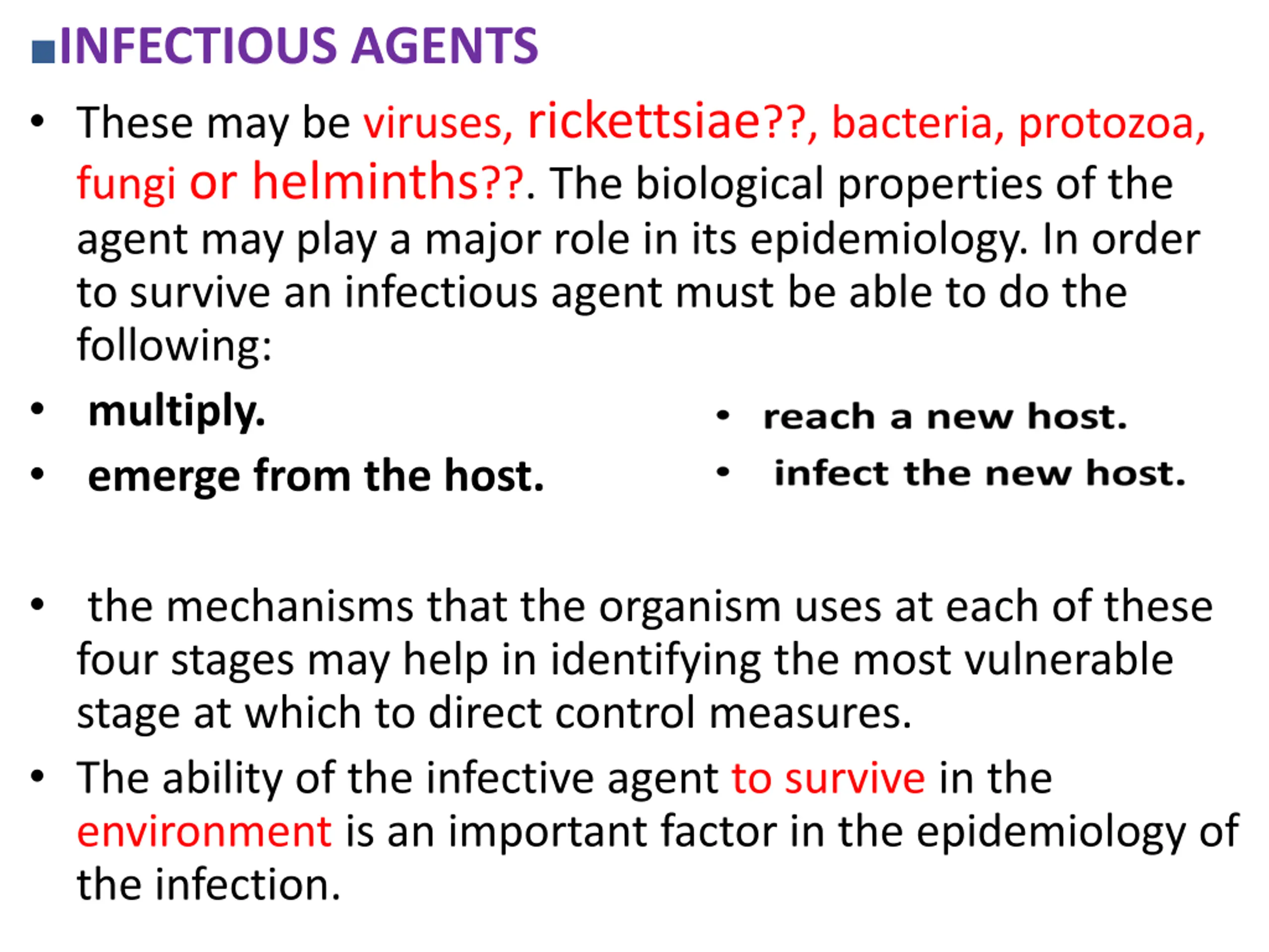 INFECTIOUS AGENTS These may be viruses, rickettsiae??, bacteria, protozoa, fungi or helminths??. The biological properties of the agent may play a major role in its epidemiology. In order to survive an infectious agent must be able to do the following: multiply. emerge from the host. the mechanisms that the organism uses at each of these four stages may help in identifying the most vulnerable stage at which to direct control measures. The ability of the infective agent to survive in the environment is an important factor in the epidemiology of the infection.