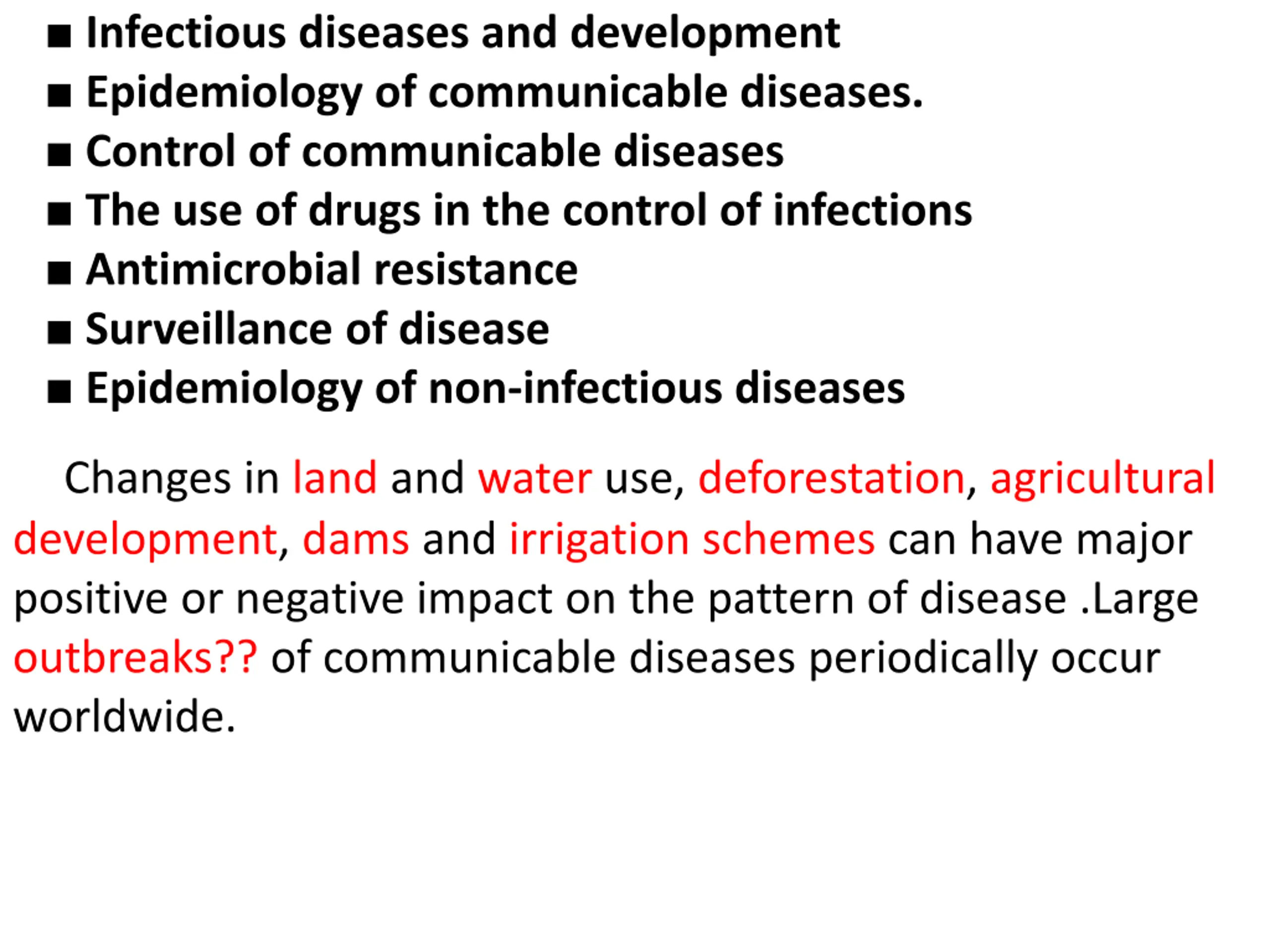 Infectious diseases and development Epidemiology of communicable diseases. Control of communicable diseases The use of drugs in the control of infections Antimicrobial resistance Surveillance of disease Epidemiology of non-infectious diseases Changes in land and water use, deforestation, agricultural development, dams and irrigation schemes can have major positive or negative impact on the pattern of disease .Large outbreaks?? of communicable diseases periodically occur worldwide.
