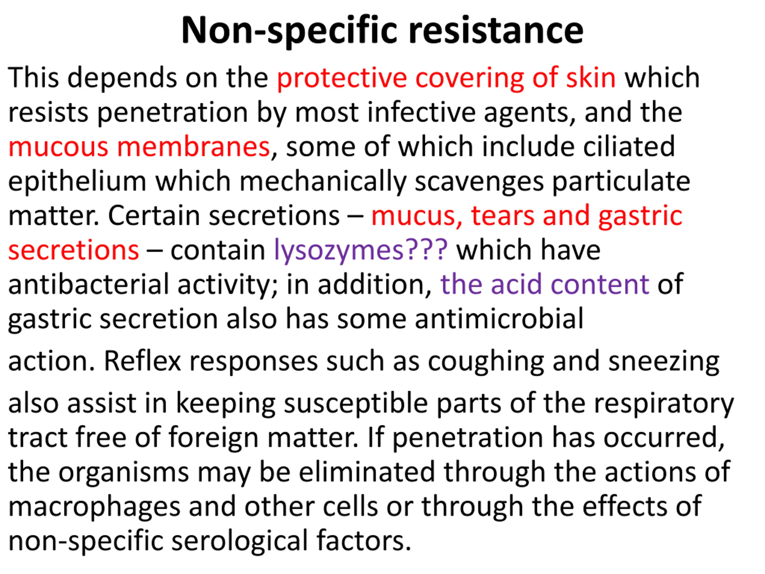Non-specific resistance This depends on the protective covering of skin which resists penetration by most infective agents, and the mucous membranes, some of which include ciliated epithelium which mechanically scavenges particulate matter. Certain secretions mucus, tears and gastric secretions contain lysozymes??? which have antibacterial activity; in addition, the acid content of gastric secretion also has some antimicrobial action. Reflex responses such as coughing and sneezing also assist in keeping susceptible parts of the respiratory tract free of foreign matter. If penetration has occurred, the organisms may be eliminated through the actions of macrophages and other cells or through the effects of non-specific serological factors.