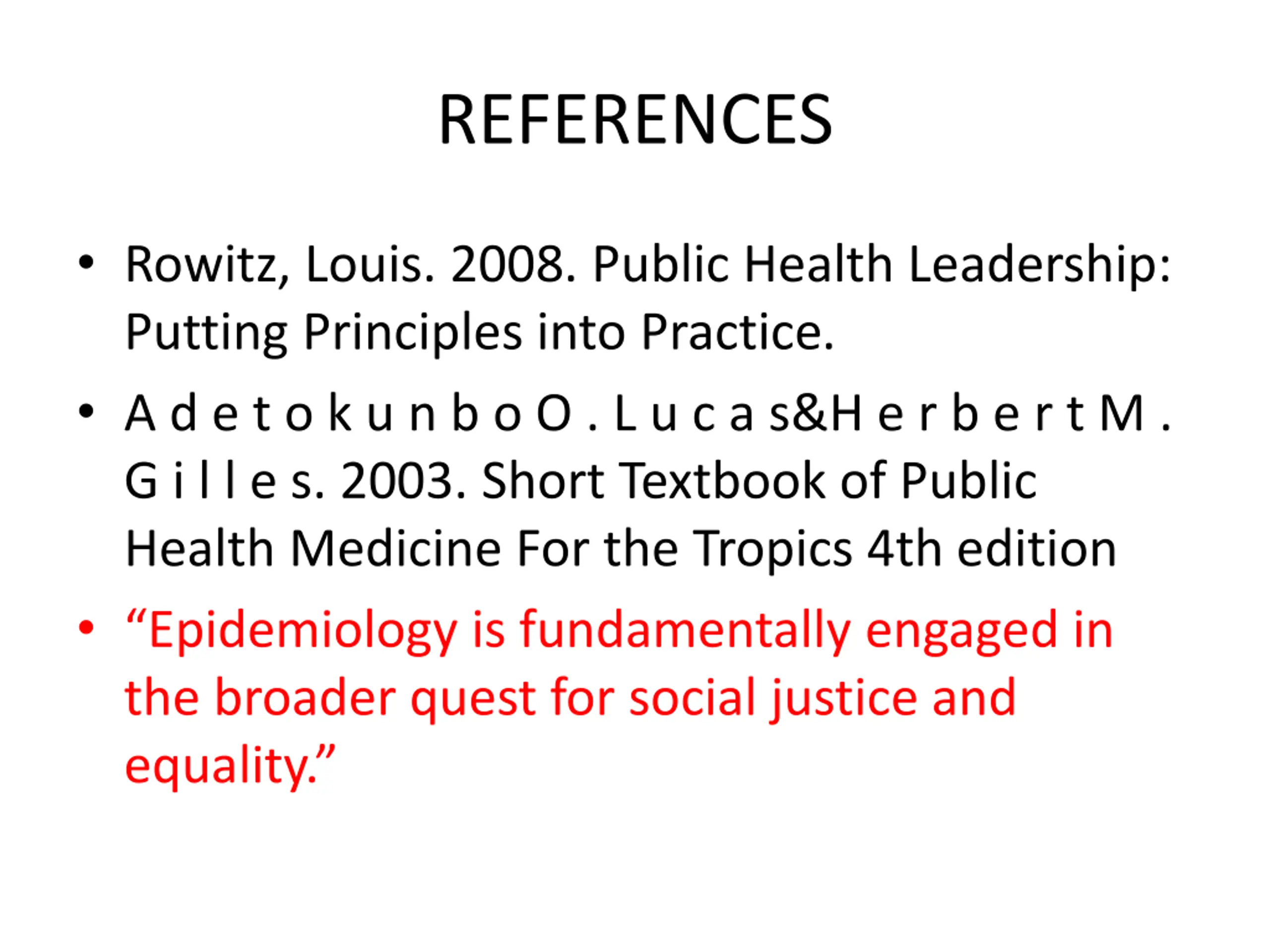 REFERENCES Rowitz, Louis. 2008. Public Health Leadership: Putting Principles into Practice. A d e t o k u n b o O . L u c a s&H e r b e r t M . G i l l e s. 2003. Short Textbook of Public Health Medicine For the Tropics 4th edition Epidemiology is fundamentally engaged in the broader quest for social justice and equality.
