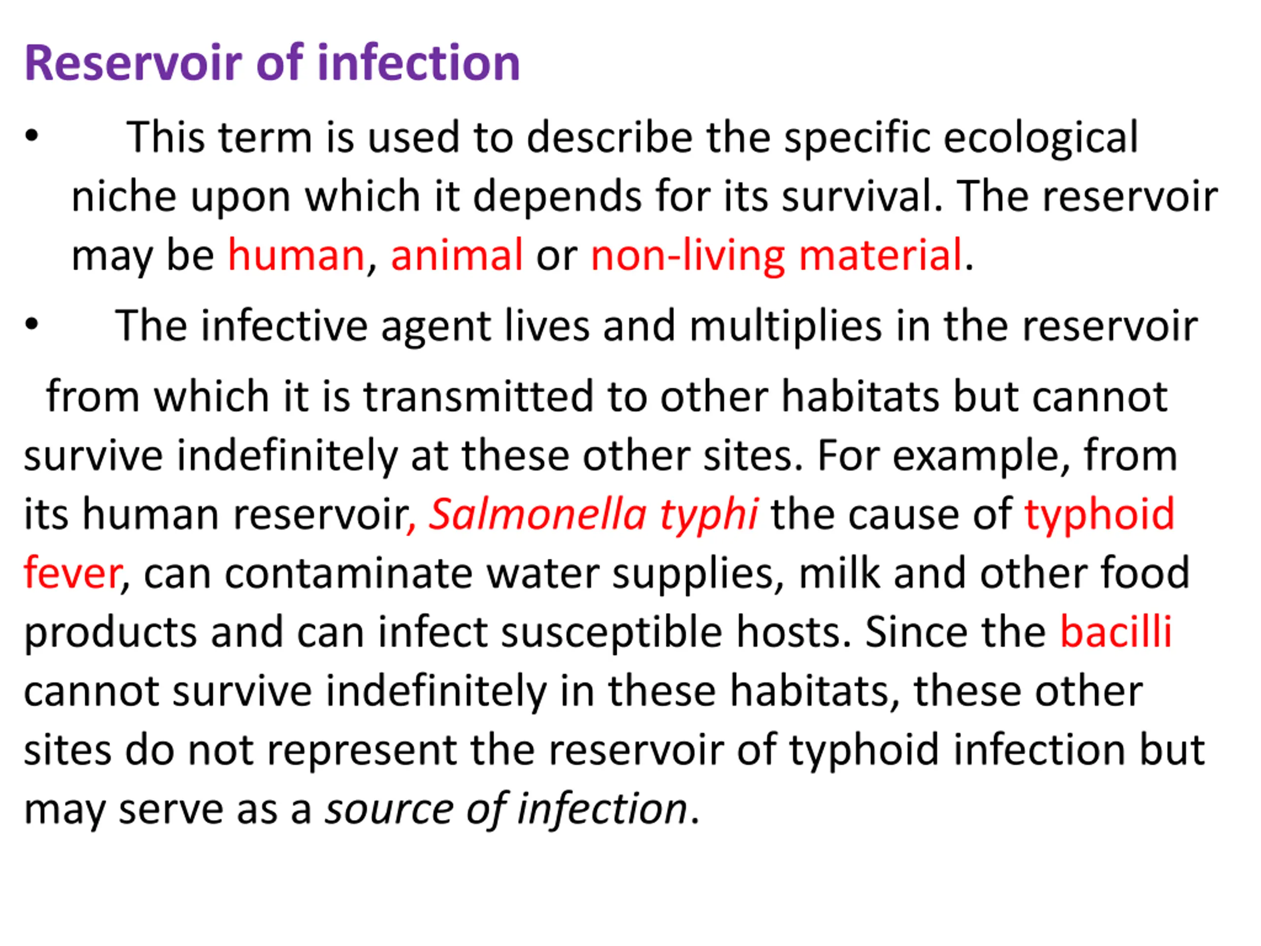 Reservoir of infection This term is used to describe the specific ecological niche upon which it depends for its survival. The reservoir may be human, animal or non-living material. The infective agent lives and multiplies in the reservoir from which it is transmitted to other habitats but cannot survive indefinitely at these other sites. For example, from its human reservoir, Salmonella typhi the cause of typhoid fever, can contaminate water supplies, milk and other food products and can infect susceptible hosts. Since the bacilli cannot survive indefinitely in these habitats, these other sites do not represent the reservoir of typhoid infection but may serve as a source of infection.