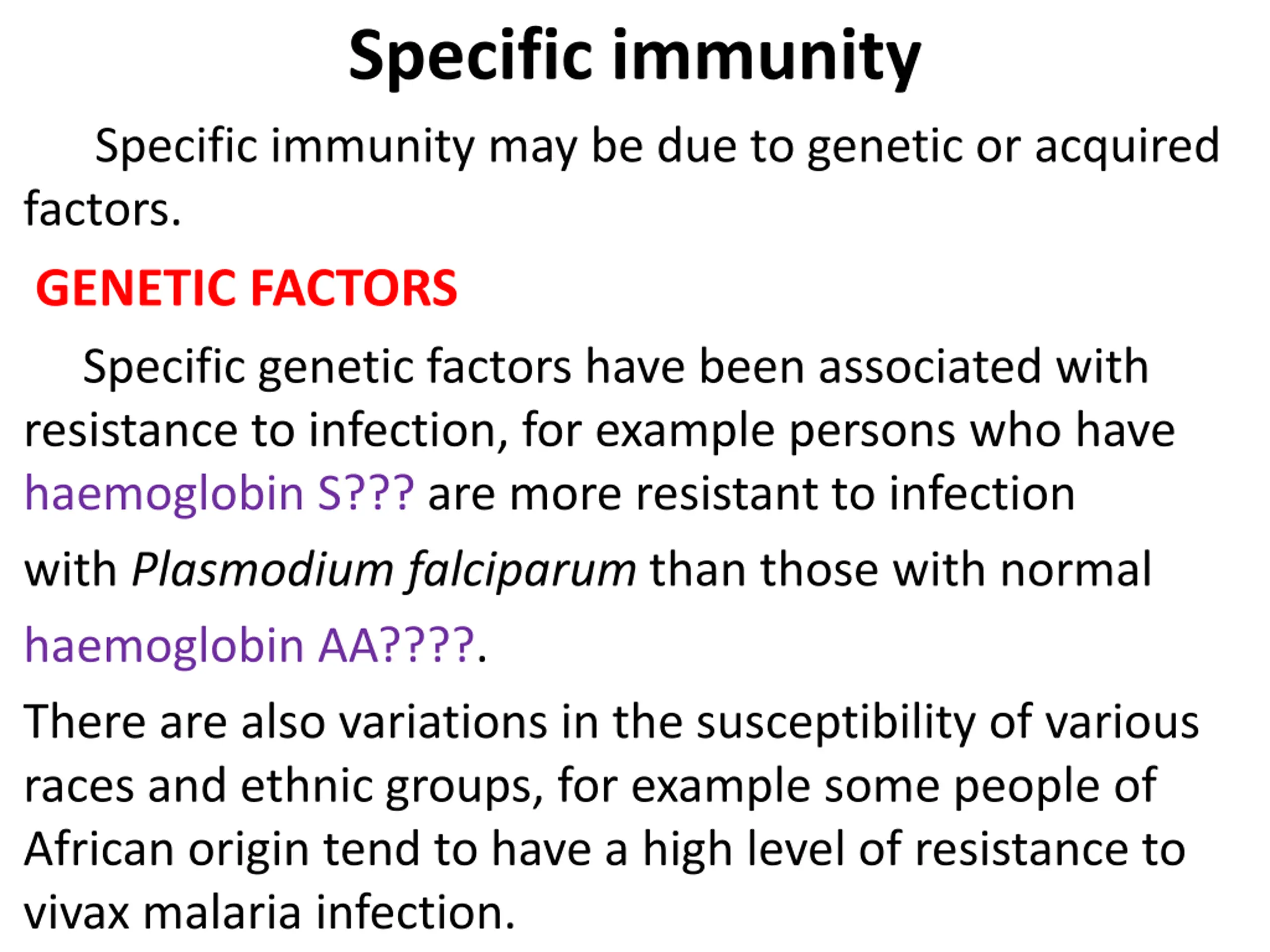 Specific immunity Specific immunity may be due to genetic or acquired factors. GENETIC FACTORS Specific genetic factors have been associated with resistance to infection, for example persons who have haemoglobin S??? are more resistant to infection with Plasmodium falciparum than those with normal haemoglobin AA????. There are also variations in the susceptibility of various races and ethnic groups, for example some people of African origin tend to have a high level of resistance to vivax malaria infection.