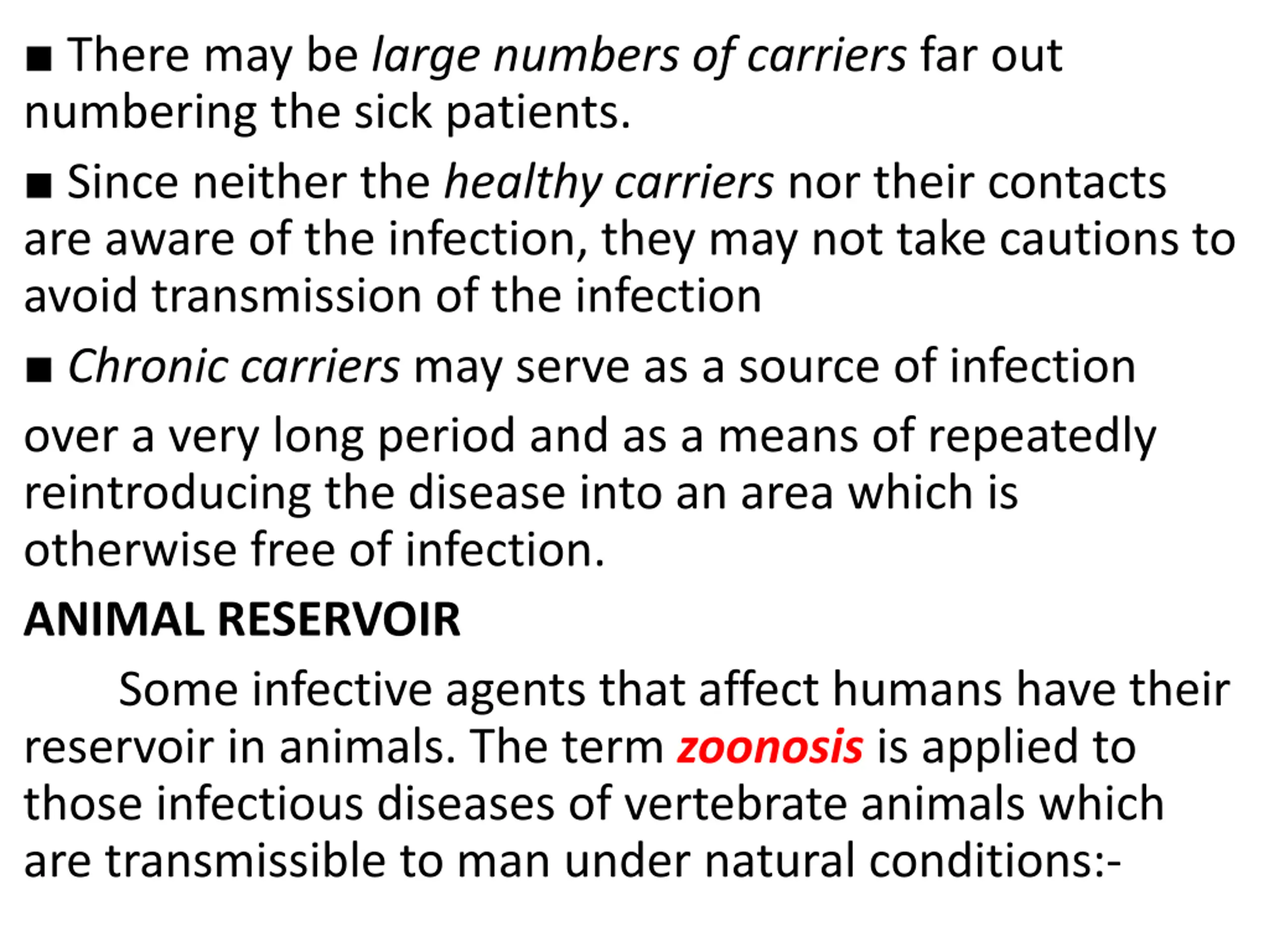 There may be large numbers of carriers far out numbering the sick patients. Since neither the healthy carriers nor their contacts are aware of the infection, they may not take cautions to avoid transmission of the infection Chronic carriers may serve as a source of infection over a very long period and as a means of repeatedly reintroducing the disease into an area which is otherwise free of infection. ANIMAL RESERVOIR Some infective agents that affect humans have their reservoir in animals. The term zoonosis is applied to those infectious diseases of vertebrate animals which are transmissible to man under natural conditions:-