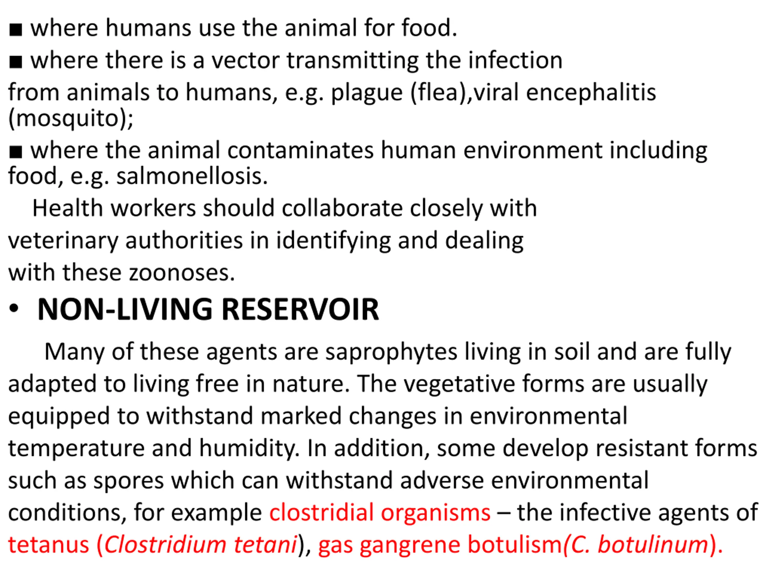where humans use the animal for food. where there is a vector transmitting the infection from animals to humans, e.g. plague (flea),viral encephalitis (mosquito); where the animal contaminates human environment including food, e.g. salmonellosis. Health workers should collaborate closely with veterinary authorities in identifying and dealing with these zoonoses. NON-LIVING RESERVOIR Many of these agents are saprophytes living in soil and are fully adapted to living free in nature. The vegetative forms are usually equipped to withstand marked changes in environmental temperature and humidity. In addition, some develop resistant forms such as spores which can withstand adverse environmental conditions, for example clostridial organisms the infective agents of tetanus (Clostridium tetani), gas gangrene botulism(C. botulinum).
