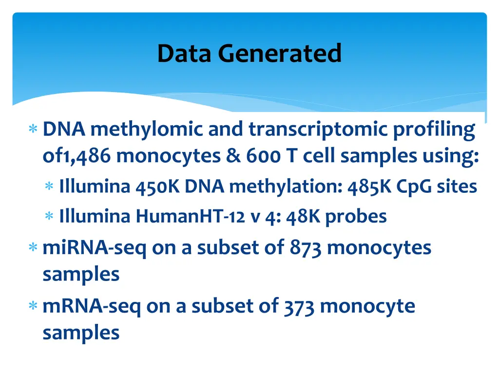Data Generated DNA methylomic and transcriptomic profiling of1,486 monocytes & 600 T cell samples using: Illumina 450K DNA methylation: 485K CpG sites Illumina HumanHT-12 v 4: 48K probes miRNA-seq on a subset of 873 monocytes samples mRNA-seq on a subset of 373 monocyte samples