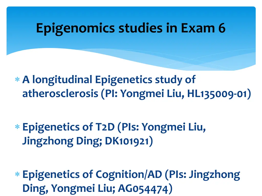 Epigenomics studies in Exam 6 A longitudinal Epigenetics study of atherosclerosis (PI: Yongmei Liu, HL135009-01) Epigenetics of T2D (PIs: Yongmei Liu, Jingzhong Ding; DK101921) Epigenetics of Cognition/AD (PIs: Jingzhong Ding, Yongmei Liu; AG054474)