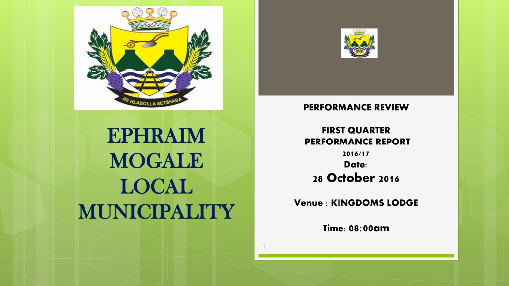 PERFORMANCE REVIEW FIRST QUARTER PERFORMANCE REPORT 2016/17 Date: 28 October 2016 EPHRAIM EPHRAIM MOGALE MOGALE LOCAL LOCAL MUNICIPALITY MUNICIPALITY Venue : KINGDOMS LODGE Time: 08:00am 1