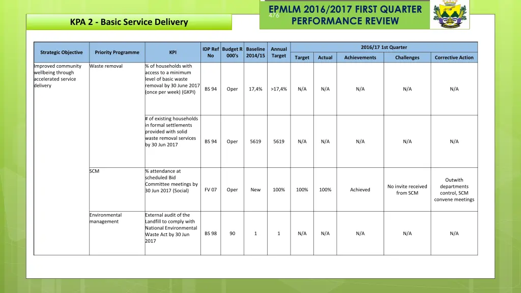 EPMLM 2016/2017 FIRST QUARTER PERFORMANCE REVIEW 486 KPA 2 - Basic Service Delivery 2016/17 1st Quarter IDP Ref No Budget R 000's Baseline 2014/15 Annual Target Strategic Objective Priority Programme KPI Target Actual Achievements Challenges Corrective Action Effective and Efficient Community Involvement Environmental management # of landscaping and greening project implemented by 30 Jun 2017 # of Cultural and Heritage festivals held by 30 Jun 2017 BS 102 1.2 1 1 N/A N/A N/A N/A N/A Community Facilities BS 210 2 2 N/A N/A N/A N/A N/A 116/117 # of cemeteries fenced by 30 Jun 2017 BS 109 690 7 6 N/A N/A N/A N/A N/A # of Mayor s cup events held by 30 Jun 2017 BS 114 65 1 1 N/A N/A N/A N/A N/A # of Mayors marathon events held by 31 Mar 2017 BS 115 40 2 1 N/A N/A N/A N/A N/A # of Club Federations supported to promote sporting development by 30 Jun 2017 SAC Officers suspended Awaiting outcome of disciplinary process BS 120 90 New 4 1 0 Not achieved