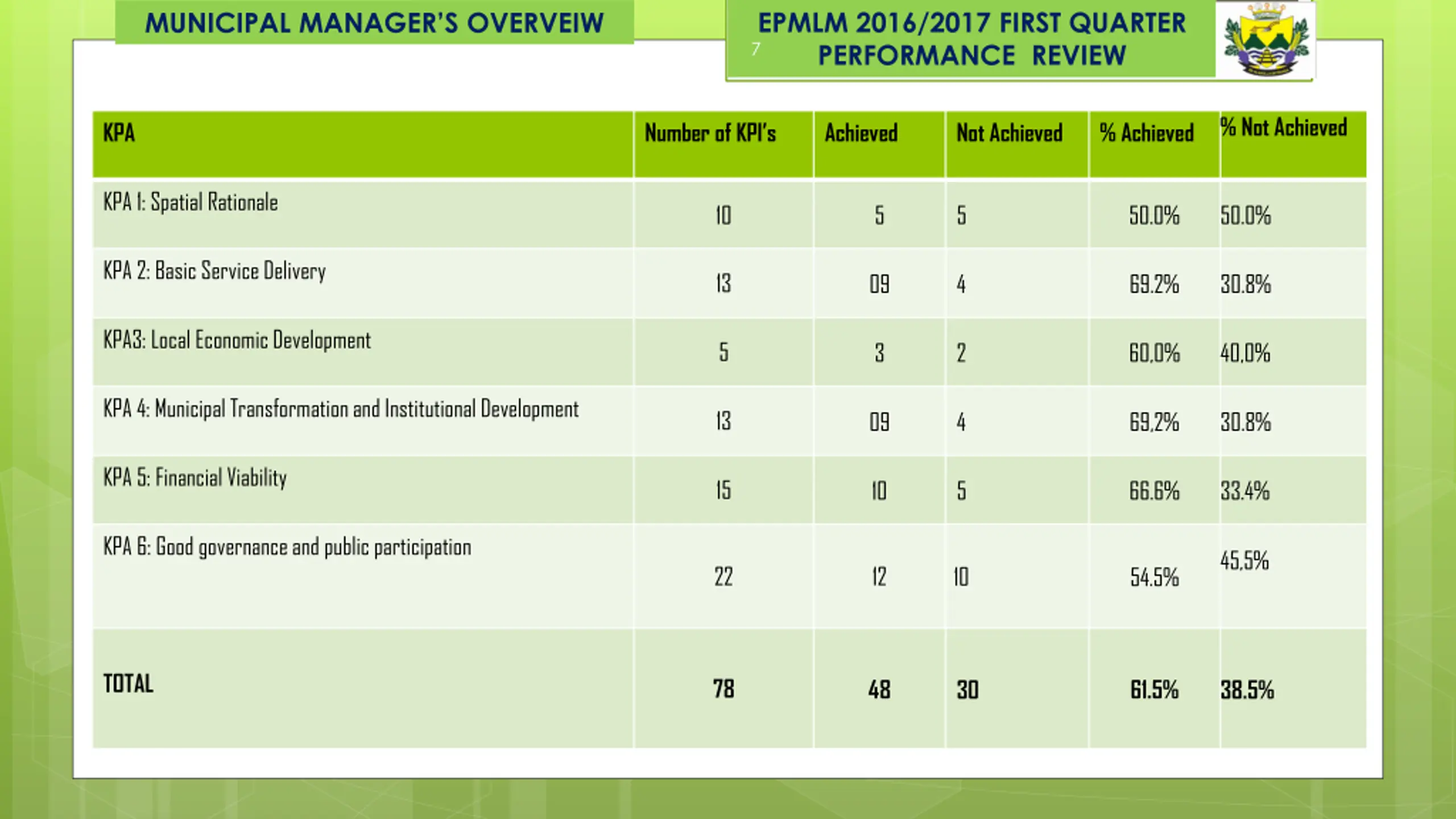 EPMLM 2016/2017 FIRST QUARTER PERFORMANCE REVIEW MUNICIPAL MANAGER S OVERVEIW 7 % Not Achieved KPA Number of KPI s Achieved Not Achieved % Achieved KPA 1: Spatial Rationale 10 5 5 50.0% 50.0% KPA 2: Basic Service Delivery 13 09 4 69.2% 30.8% KPA3: Local Economic Development 5 3 2 60,0% 40,0% KPA 4: Municipal Transformation and Institutional Development 13 09 4 69,2% 30.8% KPA 5: Financial Viability 15 10 5 66.6% 33.4% KPA 6: Good governance and public participation 45,5% 22 12 10 54.5% TOTAL 78 48 61.5% 30 38.5%