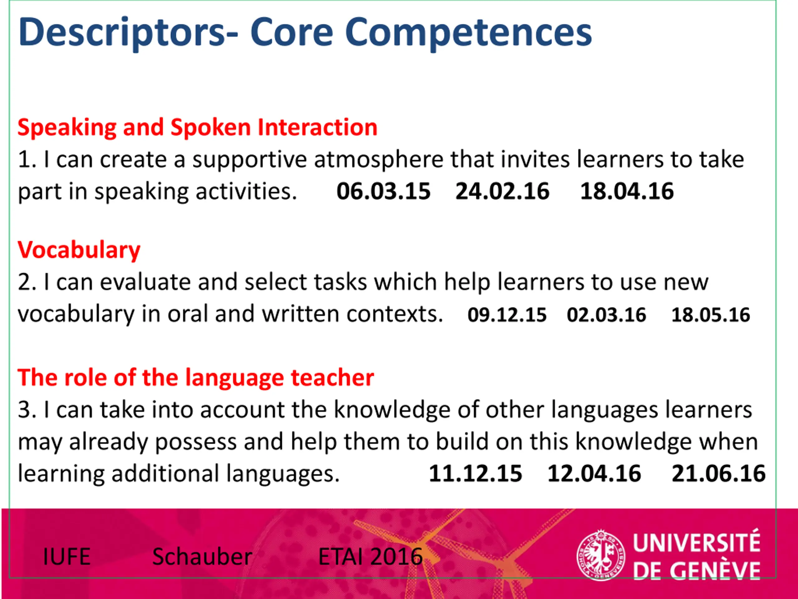 Descriptors- Core Competences Speaking and Spoken Interaction 1. I can create a supportive atmosphere that invites learners to take part in speaking activities. 06.03.15 24.02.16 18.04.16 Vocabulary 2. I can evaluate and select tasks which help learners to use new vocabulary in oral and written contexts. 09.12.15 02.03.16 18.05.16 The role of the language teacher 3. I can take into account the knowledge of other languages learners may already possess and help them to build on this knowledge when learning additional languages. 11.12.15 12.04.16 21.06.16 IUFE Schauber ETAI 2016