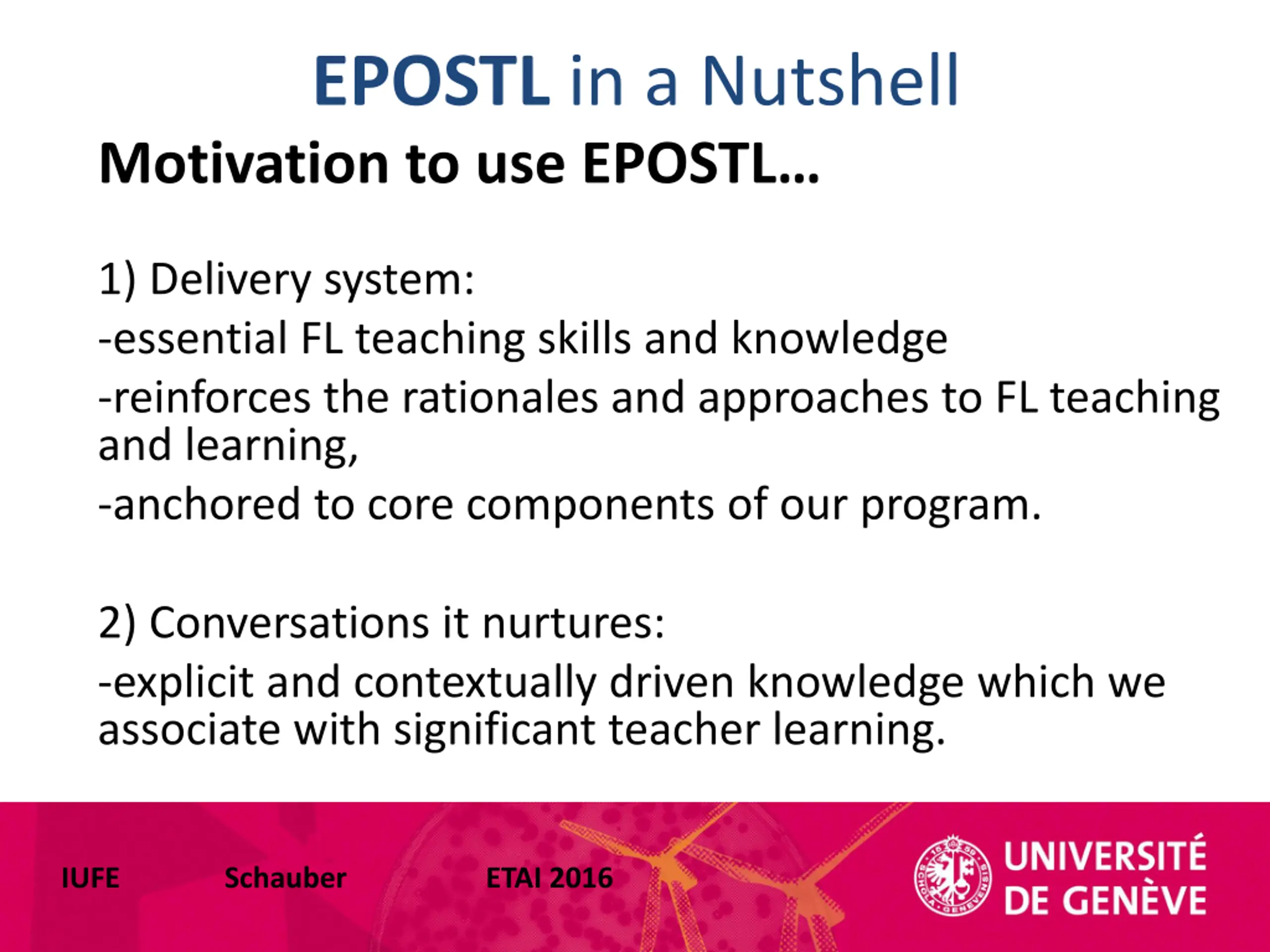 EPOSTL in a Nutshell Motivation to use EPOSTL 1) Delivery system: -essential FL teaching skills and knowledge -reinforces the rationales and approaches to FL teaching and learning, -anchored to core components of our program. 2) Conversations it nurtures: -explicit and contextually driven knowledge which we associate with significant teacher learning. IUFE Schauber ETAI 2016