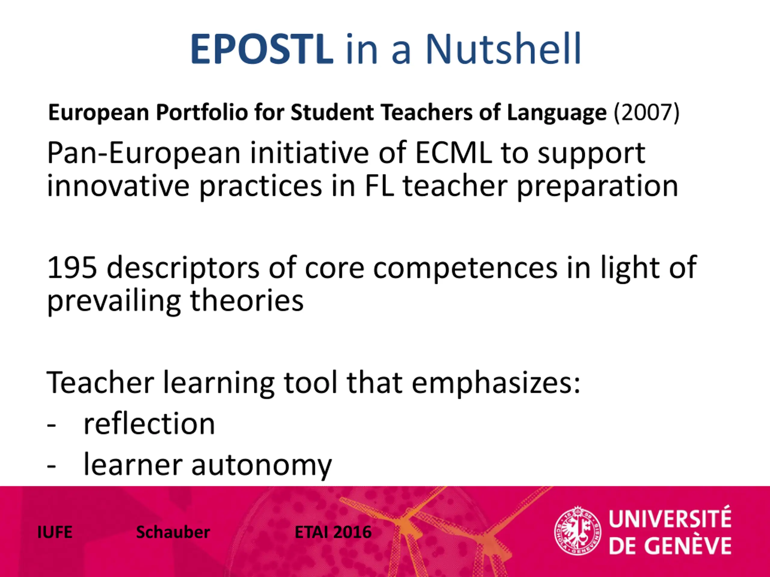 EPOSTL in a Nutshell European Portfolio for Student Teachers of Language (2007) Pan-European initiative of ECML to support innovative practices in FL teacher preparation 195 descriptors of core competences in light of prevailing theories Teacher learning tool that emphasizes: - reflection - learner autonomy IUFE Schauber ETAI 2016