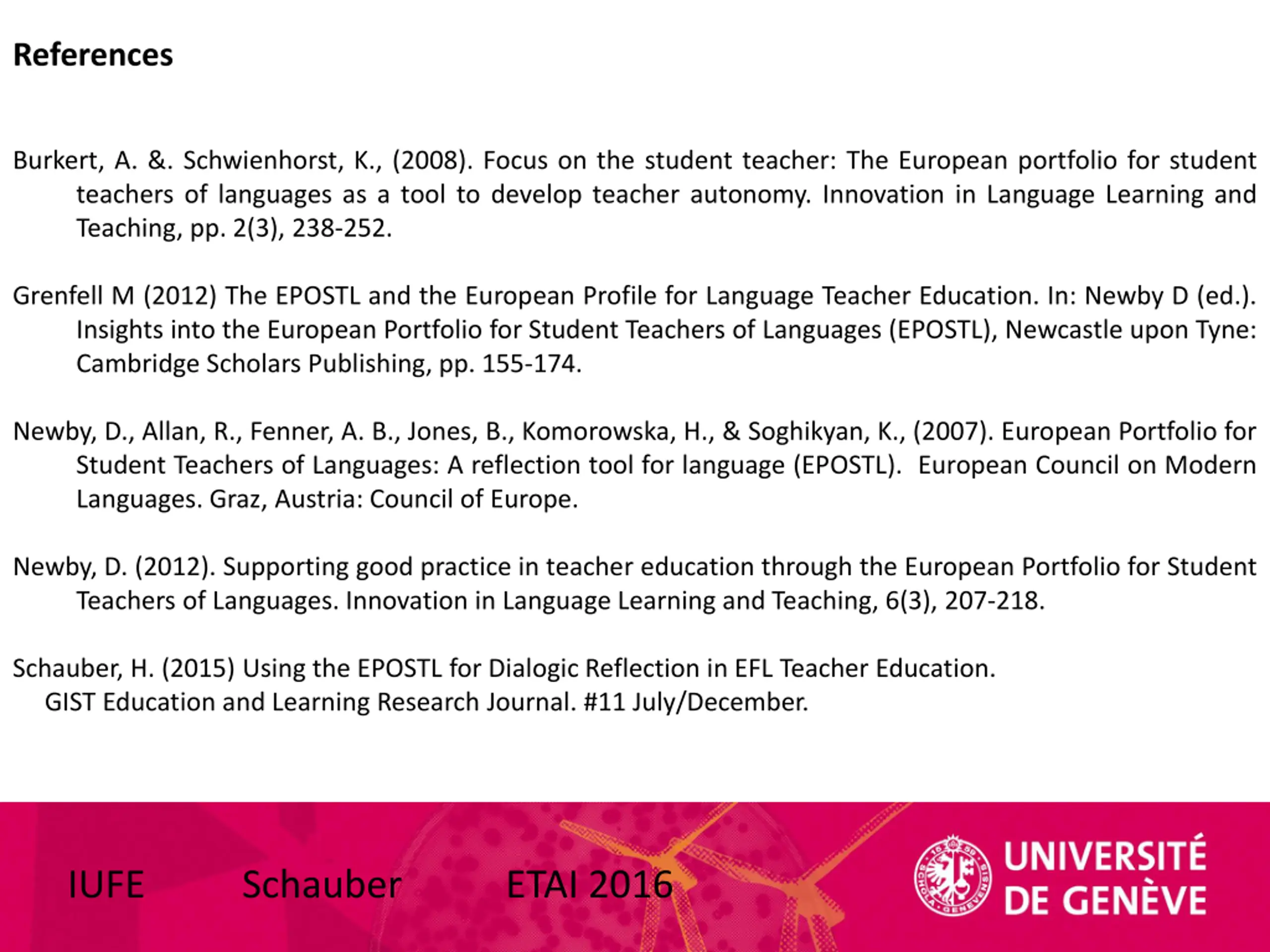 References Burkert, A. &. Schwienhorst, K., (2008). Focus on the student teacher: The European portfolio for student teachers of languages as a tool to develop teacher autonomy. Innovation in Language Learning and Teaching, pp. 2(3), 238-252. Grenfell M (2012) The EPOSTL and the European Profile for Language Teacher Education. In: Newby D (ed.). Insights into the European Portfolio for Student Teachers of Languages (EPOSTL), Newcastle upon Tyne: Cambridge Scholars Publishing, pp. 155-174. Newby, D., Allan, R., Fenner, A. B., Jones, B., Komorowska, H., & Soghikyan, K., (2007). European Portfolio for Student Teachers of Languages: A reflection tool for language (EPOSTL). European Council on Modern Languages. Graz, Austria: Council of Europe. Newby, D. (2012). Supporting good practice in teacher education through the European Portfolio for Student Teachers of Languages. Innovation in Language Learning and Teaching, 6(3), 207-218. Schauber, H. (2015) Using the EPOSTL for Dialogic Reflection in EFL Teacher Education. GIST Education and Learning Research Journal. #11 July/December. IUFE Schauber ETAI 2016