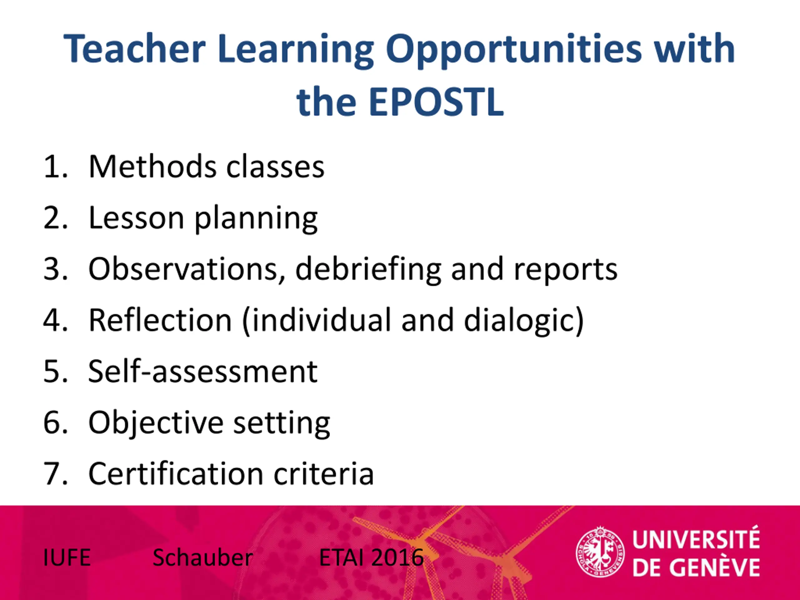 Teacher Learning Opportunities with the EPOSTL 1. Methods classes 2. Lesson planning 3. Observations, debriefing and reports 4. Reflection (individual and dialogic) 5. Self-assessment 6. Objective setting 7. Certification criteria IUFE Schauber ETAI 2016