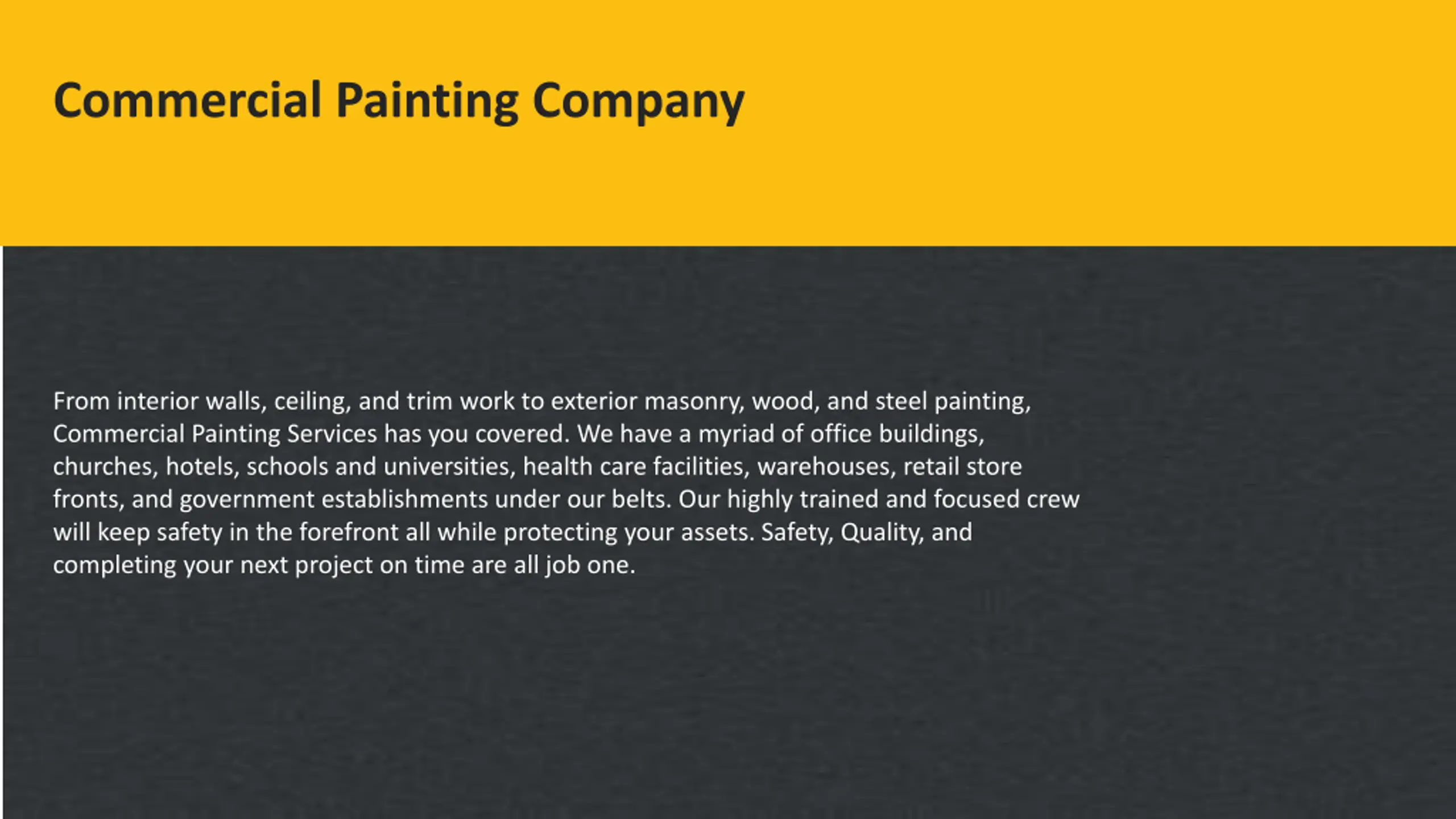 Commercial Painting Company From interior walls, ceiling, and trim work to exterior masonry, wood, and steel painting, Commercial Painting Services has you covered. We have a myriad of office buildings, churches, hotels, schools and universities, health care facilities, warehouses, retail store fronts, and government establishments under our belts. Our highly trained and focused crew will keep safety in the forefront all while protecting your assets. Safety, Quality, and completing your next project on time are all job one.