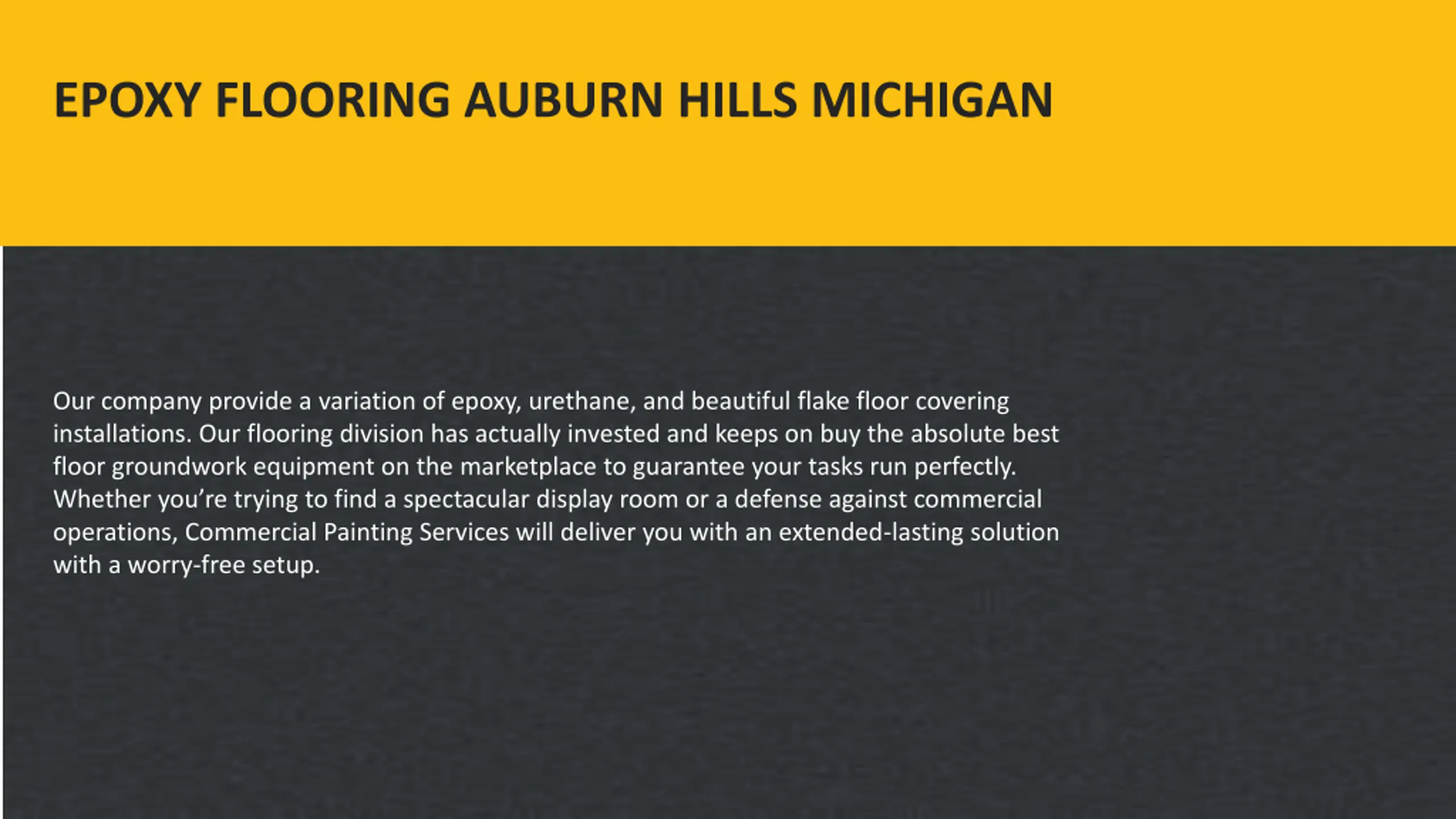 EPOXY FLOORING AUBURN HILLS MICHIGAN Commercial Painting Services provides the Auburn Hills, MI. market with top quality epoxy and urethane flooring installations for all kinds of commercial & business complexes. An operations downtime is often kept to a minimum during the epoxy floor coverings installation process. Our epoxy floor covering experts are well-skilled epoxy flooring installers with a mindset for proper flooring planning. We keep your project running smooth and on your schedule. Your finish date is our priority whether, or not it s 5,000 square feet or 50,000 square feet.