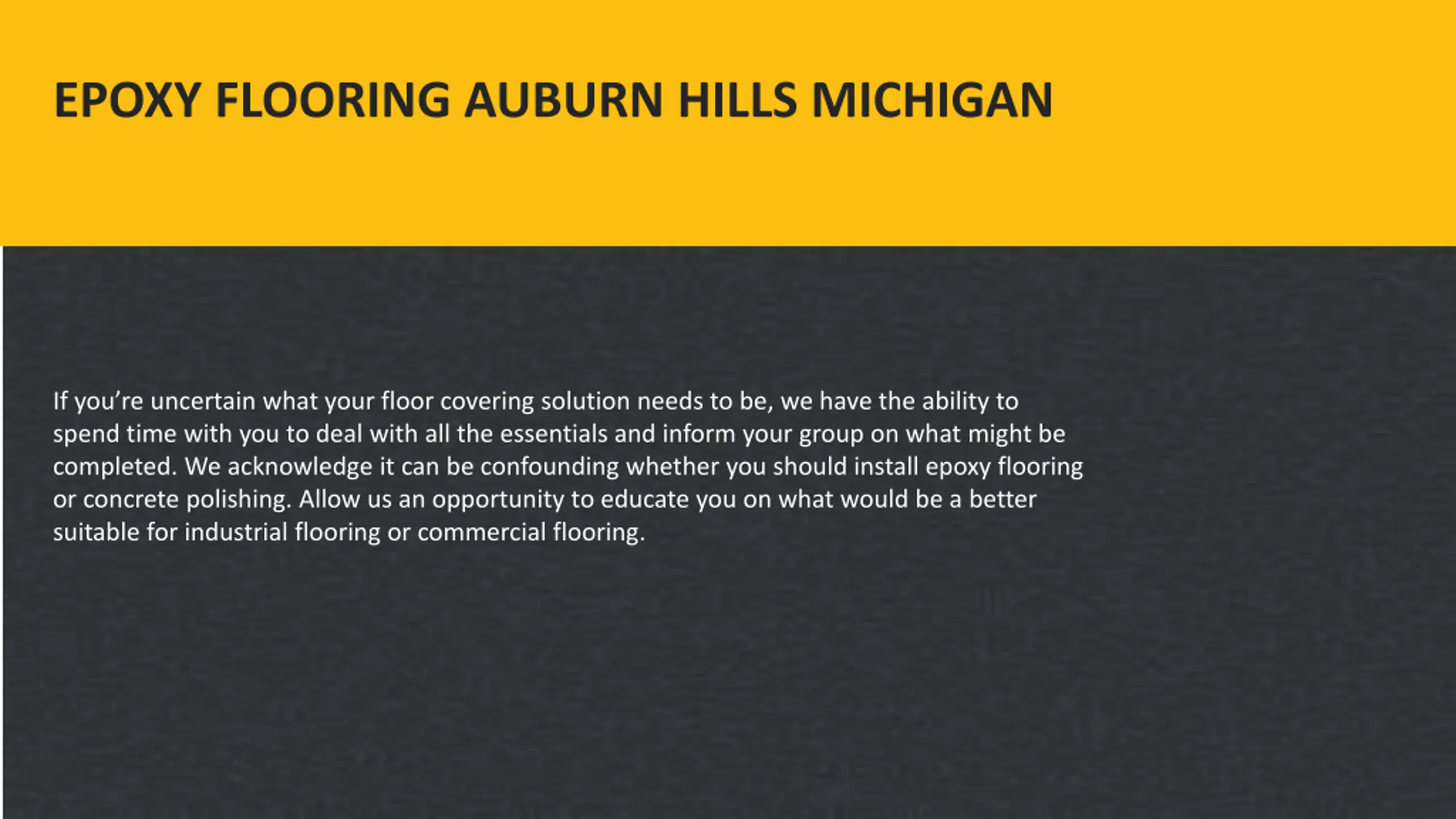 EPOXY FLOORING AUBURN HILLS MICHIGAN If you re uncertain what your floor covering solution needs to be, we have the ability to spend time with you to deal with all the essentials and inform your group on what might be completed. We acknowledge it can be confounding whether you should install epoxy flooring or concrete polishing. Allow us an opportunity to educate you on what would be a better suitable for industrial flooring or commercial flooring.