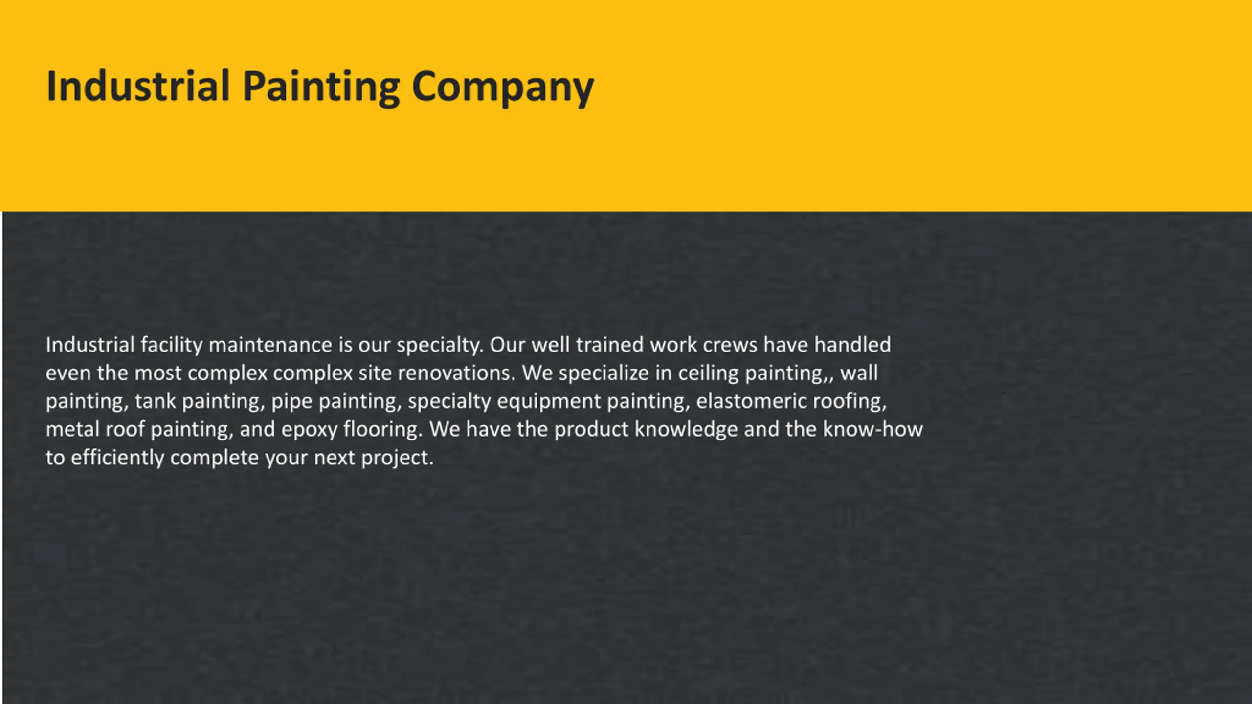 Industrial Painting Company Industrial facility maintenance is our specialty. Our well trained work crews have handled even the most complex complex site renovations. We specialize in ceiling painting,, wall painting, tank painting, pipe painting, specialty equipment painting, elastomeric roofing, metal roof painting, and epoxy flooring. We have the product knowledge and the know-how to efficiently complete your next project.