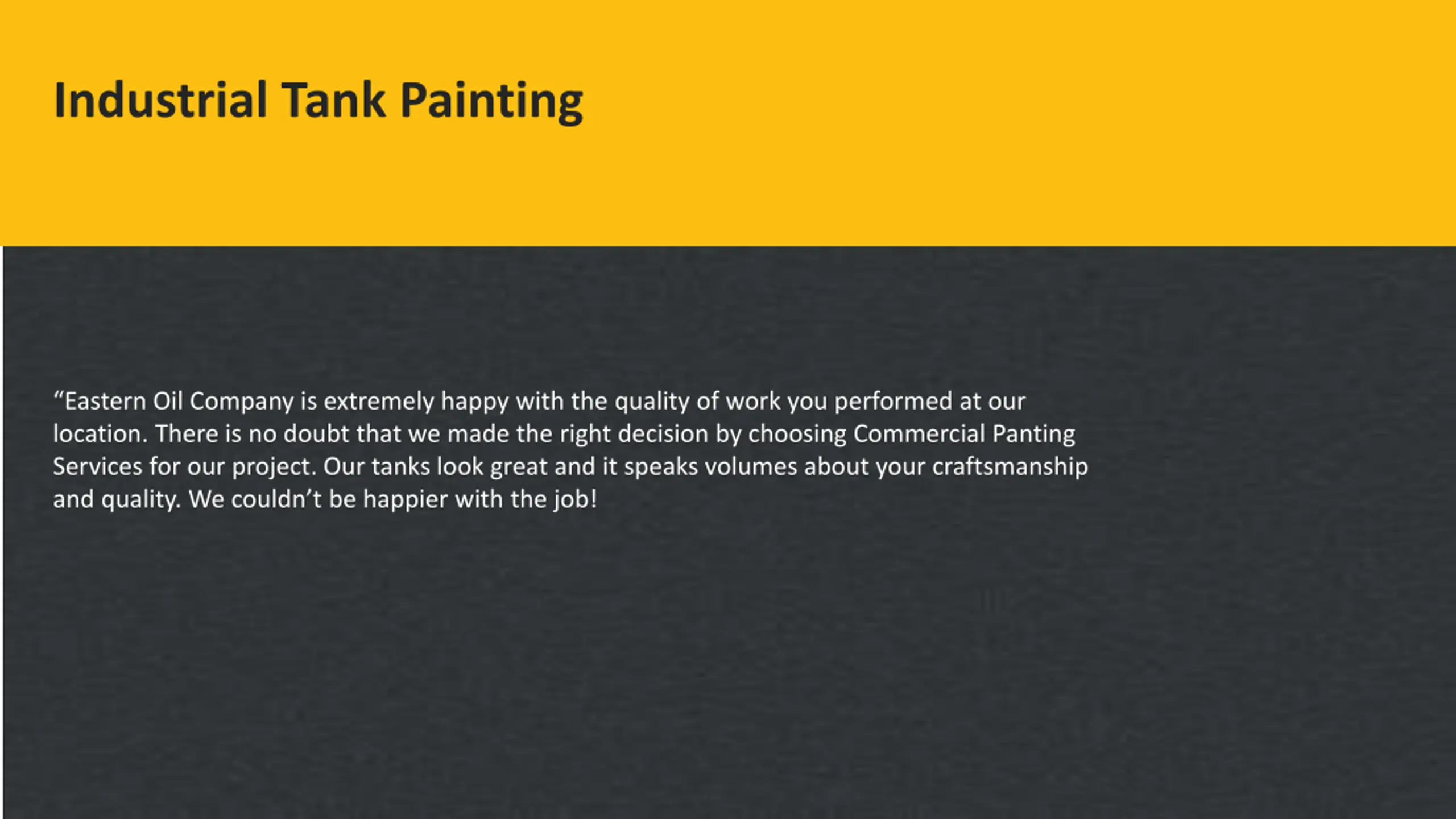Industrial Tank Painting Eastern Oil Company is extremely happy with the quality of work you performed at our location. There is no doubt that we made the right decision by choosing Commercial Panting Services for our project. Our tanks look great and it speaks volumes about your craftsmanship and quality. We couldn t be happier with the job!
