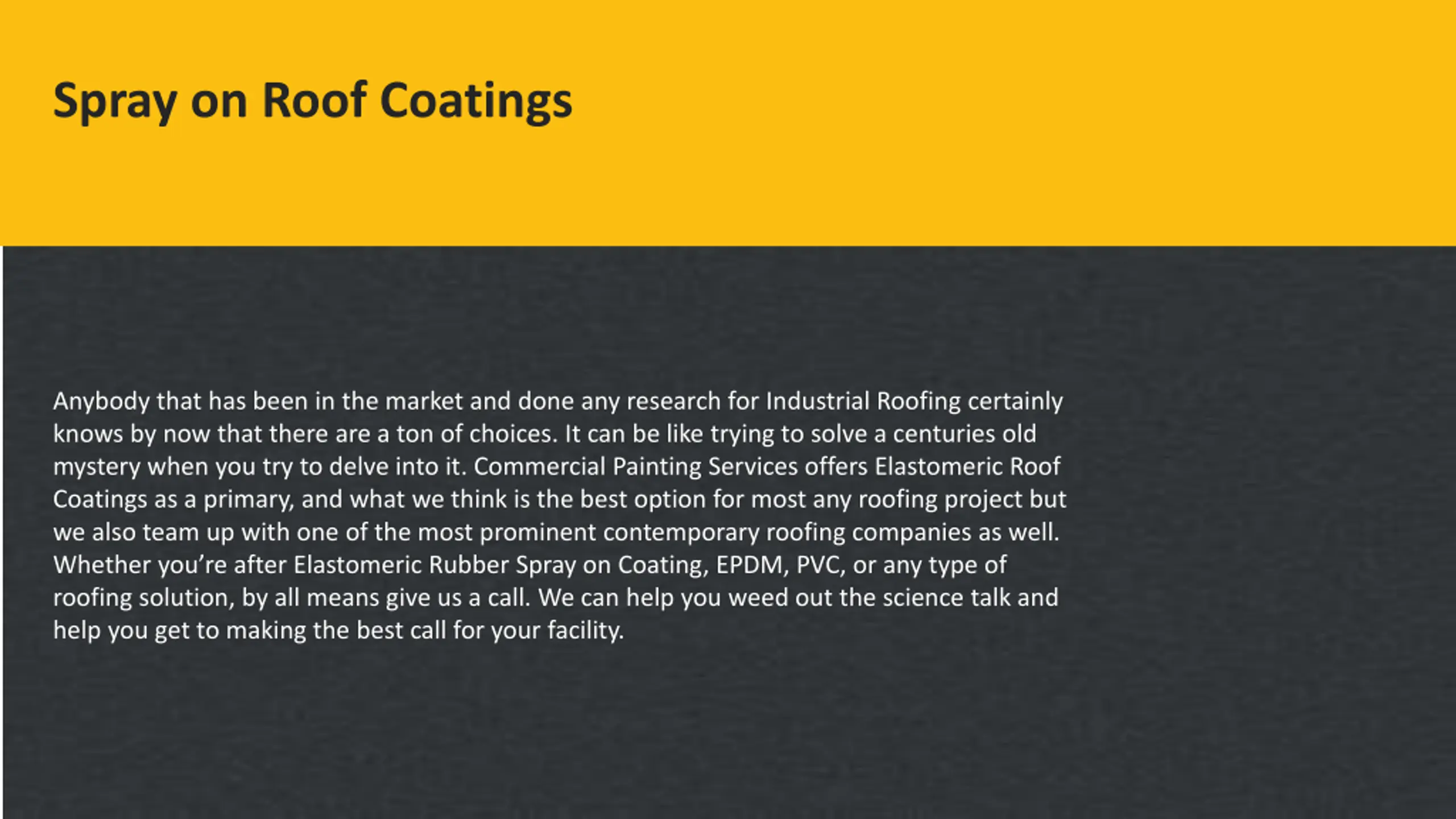Spray on Roof Coatings Anybody that has been in the market and done any research for Industrial Roofing certainly knows by now that there are a ton of choices. It can be like trying to solve a centuries old mystery when you try to delve into it. Commercial Painting Services offers Elastomeric Roof Coatings as a primary, and what we think is the best option for most any roofing project but we also team up with one of the most prominent contemporary roofing companies as well. Whether you re after Elastomeric Rubber Spray on Coating, EPDM, PVC, or any type of roofing solution, by all means give us a call. We can help you weed out the science talk and help you get to making the best call for your facility.