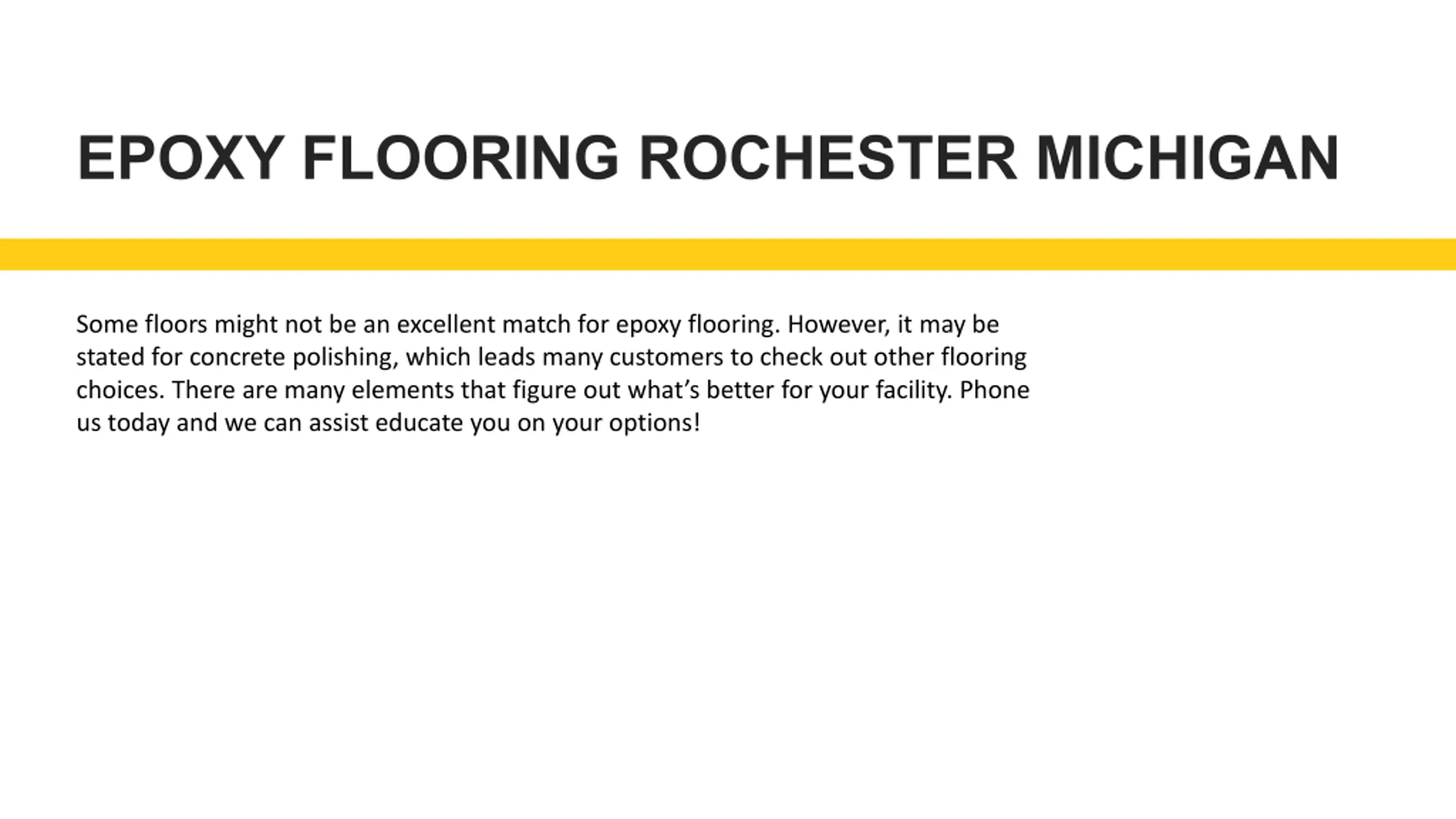 EPOXY FLOORING ROCHESTER MICHIGAN Some floors might not be an excellent match for epoxy flooring. However, it may be stated for concrete polishing, which leads many customers to check out other flooring choices. There are many elements that figure out what s better for your facility. Phone us today and we can assist educate you on your options!