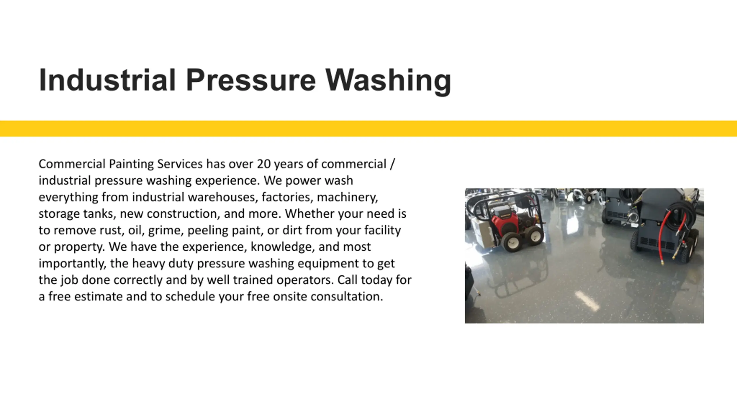 Industrial Pressure Washing Commercial Painting Services has over 20 years of commercial / industrial pressure washing experience. We power wash everything from industrial warehouses, factories, machinery, storage tanks, new construction, and more. Whether your need is to remove rust, oil, grime, peeling paint, or dirt from your facility or property. We have the experience, knowledge, and most importantly, the heavy duty pressure washing equipment to get the job done correctly and by well trained operators. Call today for a free estimate and to schedule your free onsite consultation.