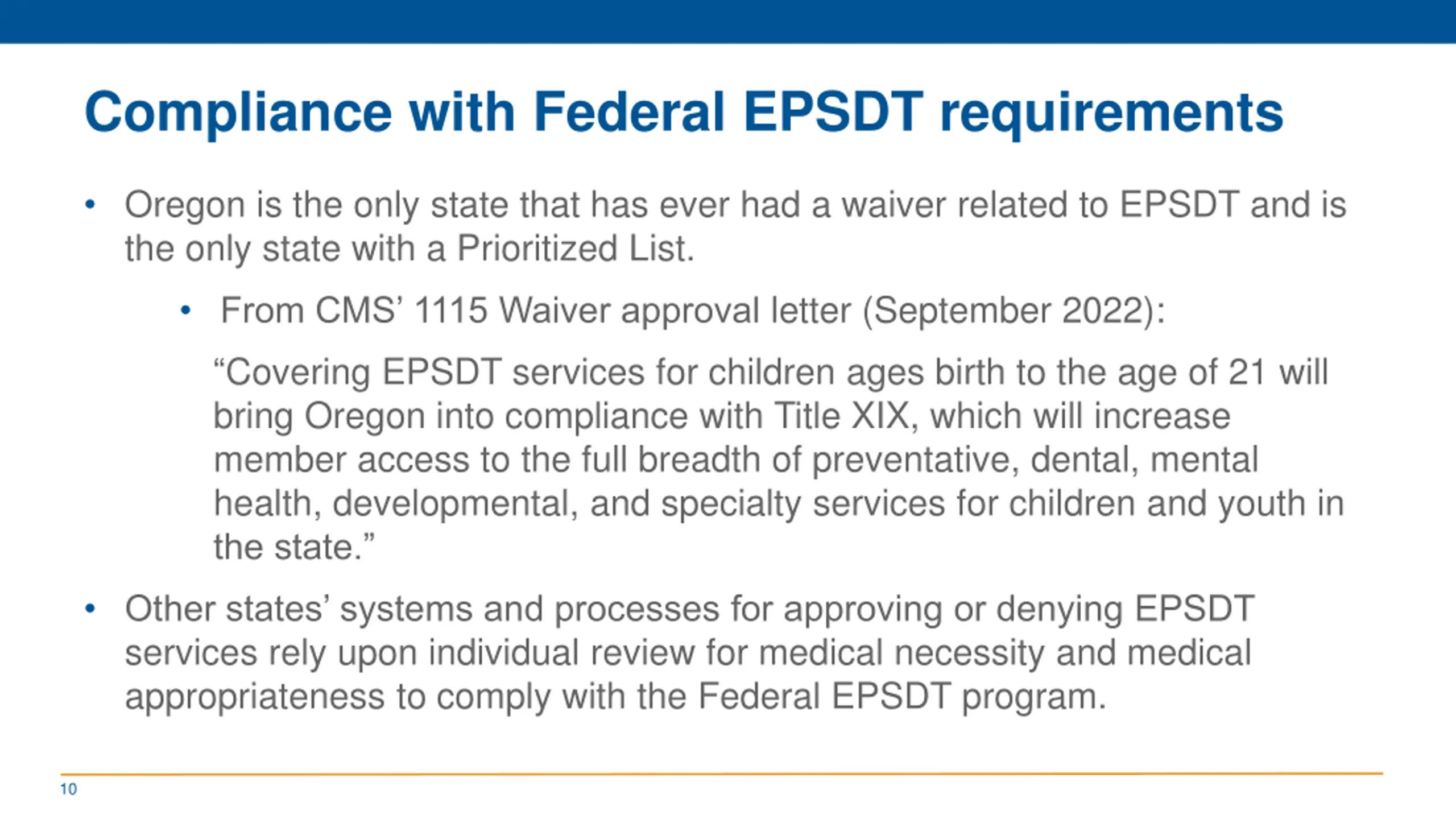 Compliance with Federal EPSDT requirements Oregon is the only state that has ever had a waiver related to EPSDT and is the only state with a Prioritized List. From CMS 1115 Waiver approval letter (September 2022): Covering EPSDT services for children ages birth to the age of 21 will bring Oregon into compliance with Title XIX, which will increase member access to the full breadth of preventative, dental, mental health, developmental, and specialty services for children and youth in the state. Other states systems and processes for approving or denying EPSDT services rely upon individual review for medical necessity and medical appropriateness to comply with the Federal EPSDT program. 10