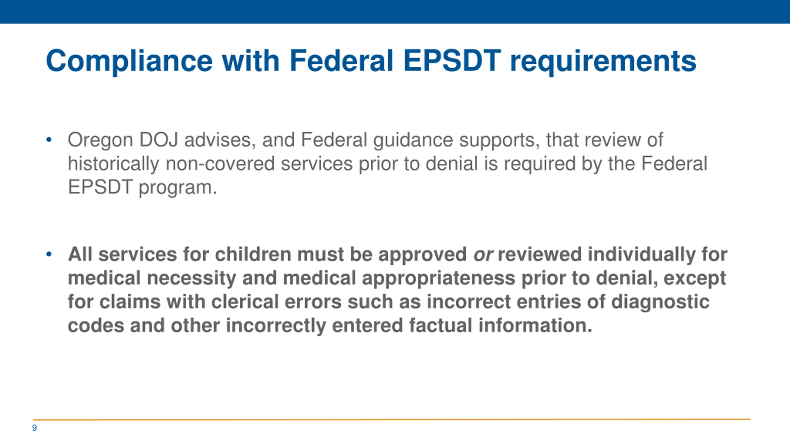 Compliance with Federal EPSDT requirements Oregon DOJ advises, and Federal guidance supports, that review of historically non-covered services prior to denial is required by the Federal EPSDT program. All services for children must be approved or reviewed individually for medical necessity and medical appropriateness prior to denial, except for claims with clerical errors such as incorrect entries of diagnostic codes and other incorrectly entered factual information. 9