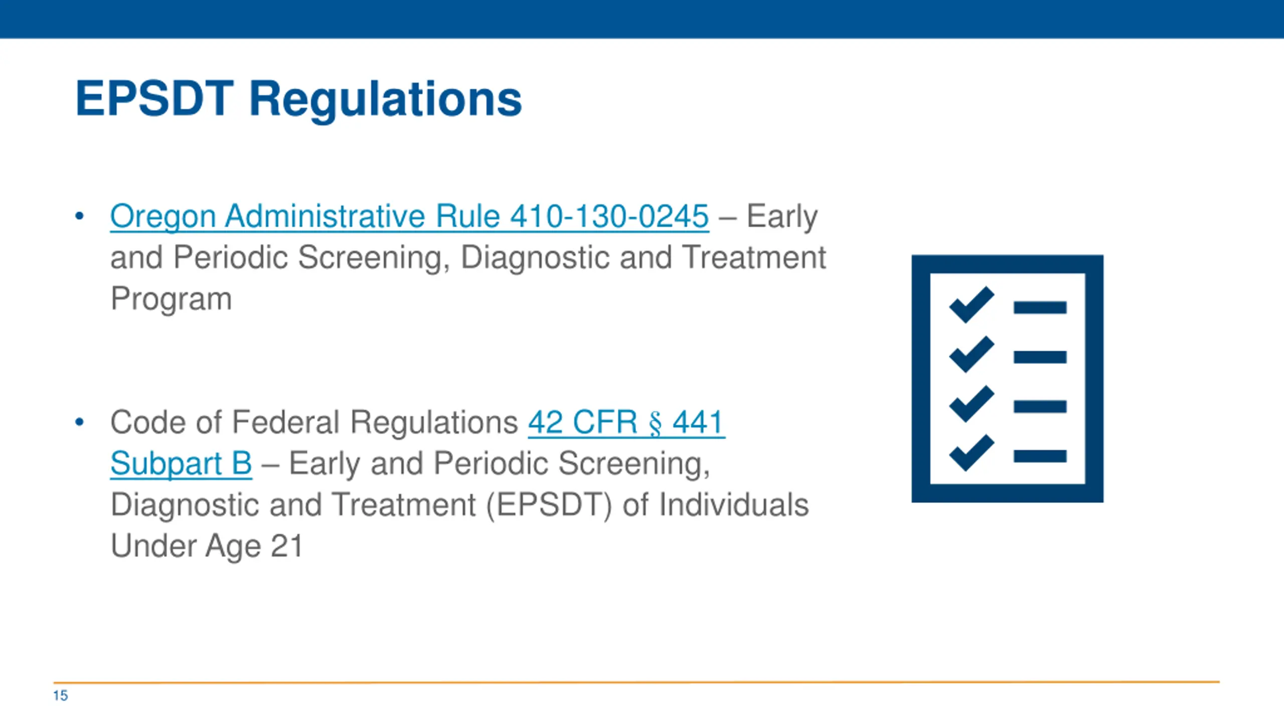 EPSDT Regulations Oregon Administrative Rule 410-130-0245 Early and Periodic Screening, Diagnostic and Treatment Program Code of Federal Regulations 42 CFR 441 Subpart B Early and Periodic Screening, Diagnostic and Treatment (EPSDT) of Individuals Under Age 21 15