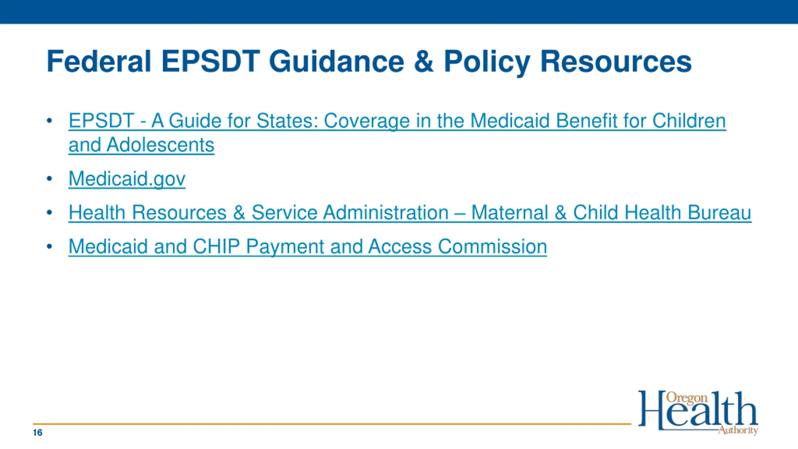 Federal EPSDT Guidance & Policy Resources EPSDT - A Guide for States: Coverage in the Medicaid Benefit for Children and Adolescents Medicaid.gov Health Resources & Service Administration Maternal & Child Health Bureau Medicaid and CHIP Payment and Access Commission 16 16 16 16