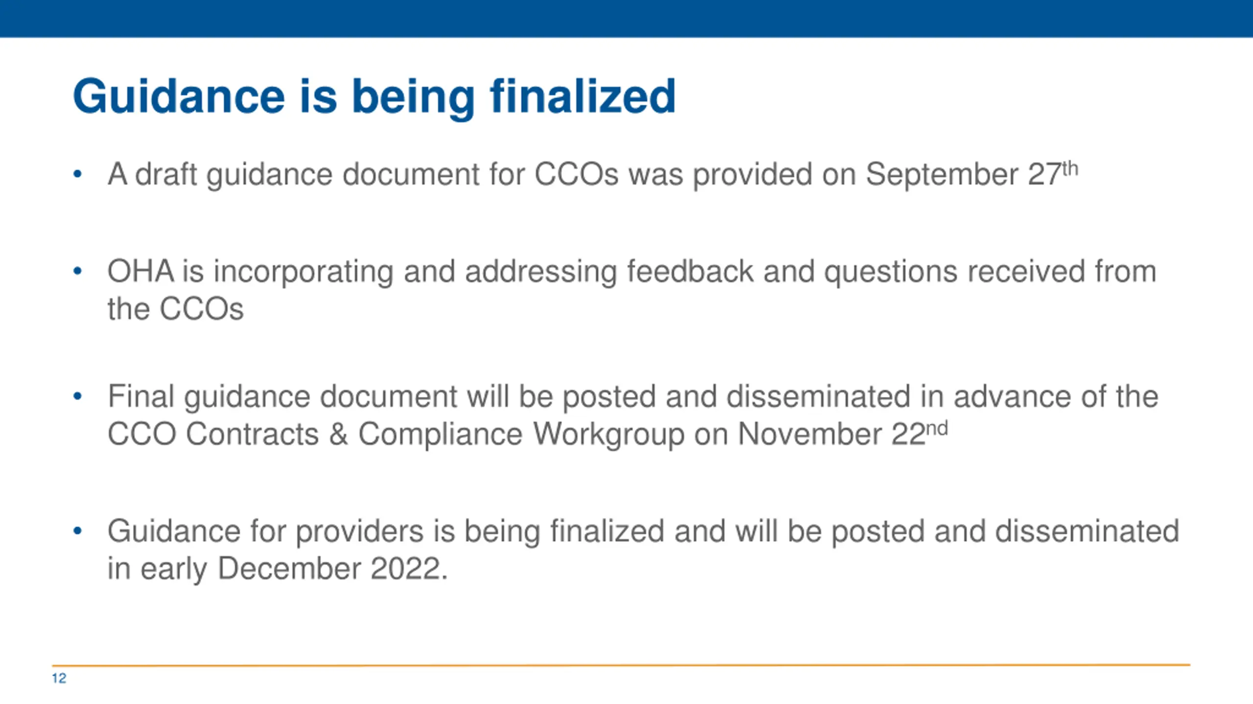 Guidance is being finalized A draft guidance document for CCOs was provided on September 27th OHA is incorporating and addressing feedback and questions received from the CCOs Final guidance document will be posted and disseminated in advance of the CCO Contracts & Compliance Workgroup on November 22nd Guidance for providers is being finalized and will be posted and disseminated in early December 2022. 12