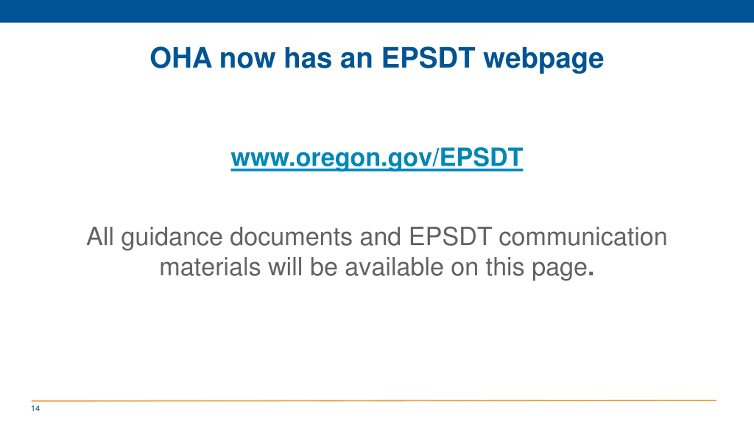 OHA now has an EPSDT webpage www.oregon.gov/EPSDT All guidance documents and EPSDT communication materials will be available on this page. 14