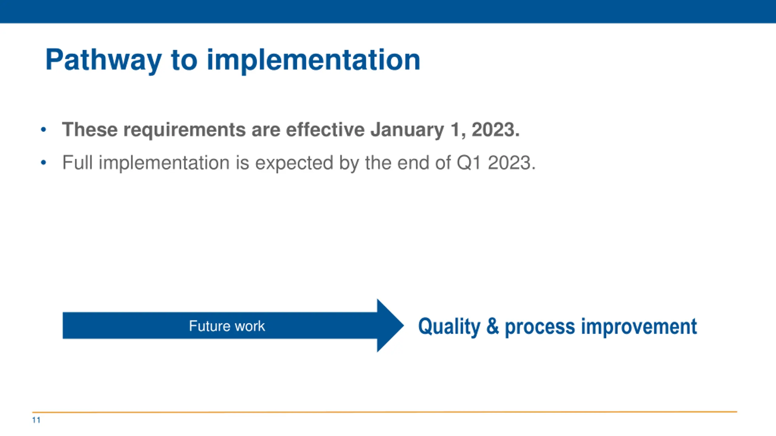 Pathway to implementation These requirements are effective January 1, 2023. Full implementation is expected by the end of Q1 2023. Quality & process improvement Future work 11