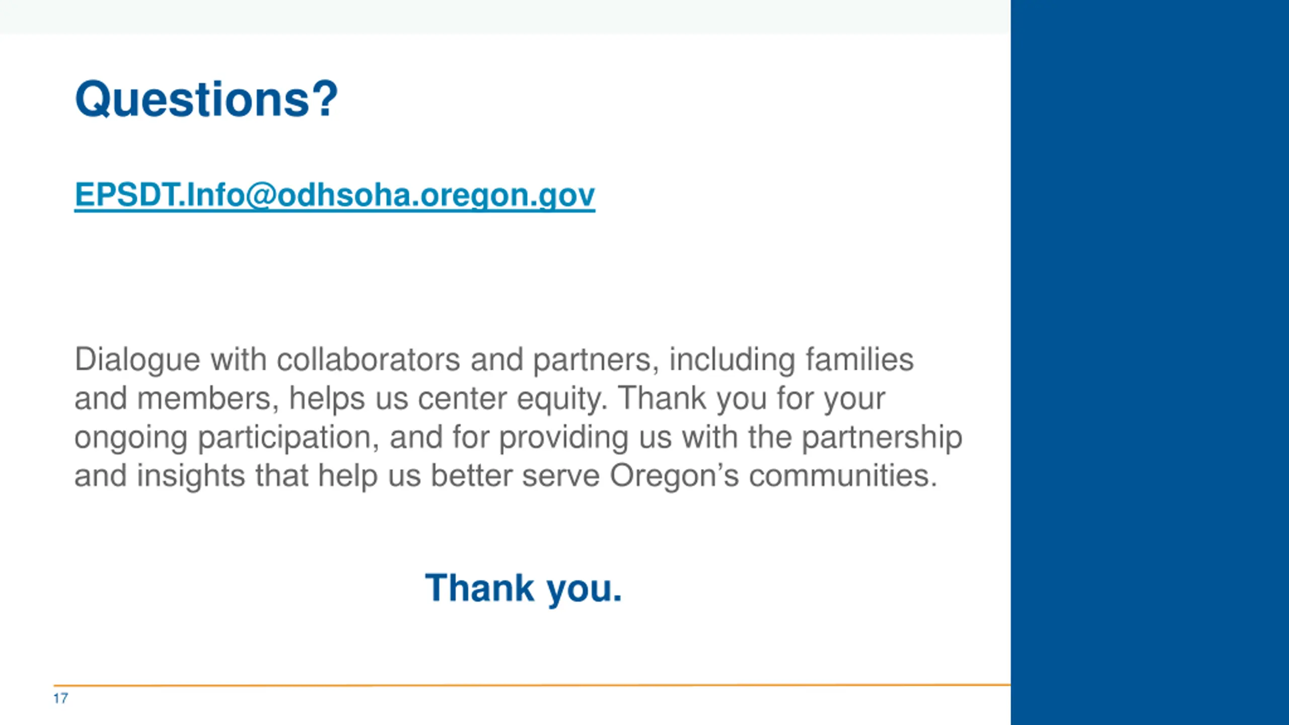 Questions? EPSDT.Info@odhsoha.oregon.gov Dialogue with collaborators and partners, including families and members, helps us center equity. Thank you for your ongoing participation, and for providing us with the partnership and insights that help us better serve Oregon s communities. Thank you. 17