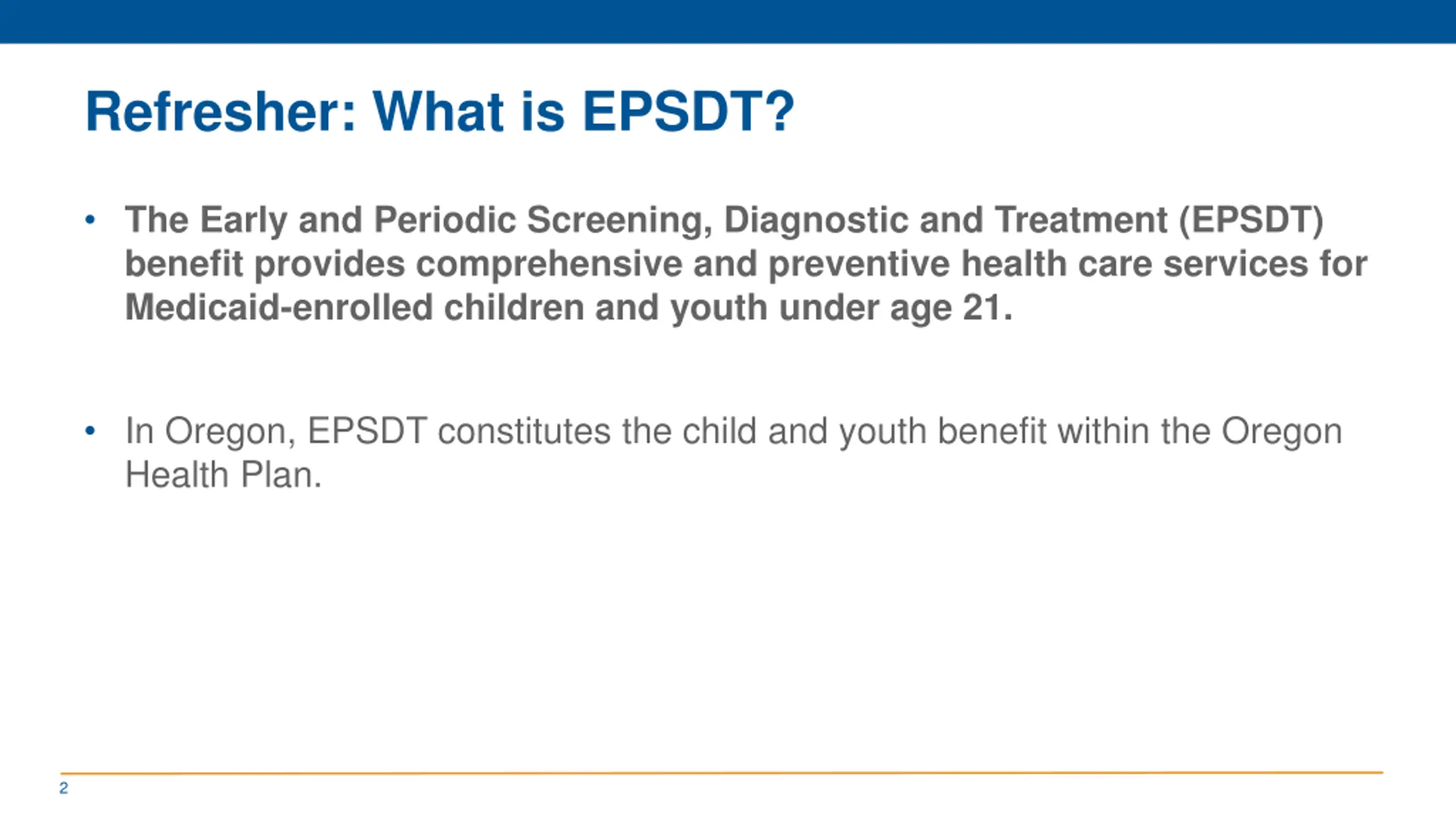 Refresher: What is EPSDT? The Early and Periodic Screening, Diagnostic and Treatment (EPSDT) benefit provides comprehensive and preventive health care services for Medicaid-enrolled children and youth under age 21. In Oregon, EPSDT constitutes the child and youth benefit within the Oregon Health Plan. 2