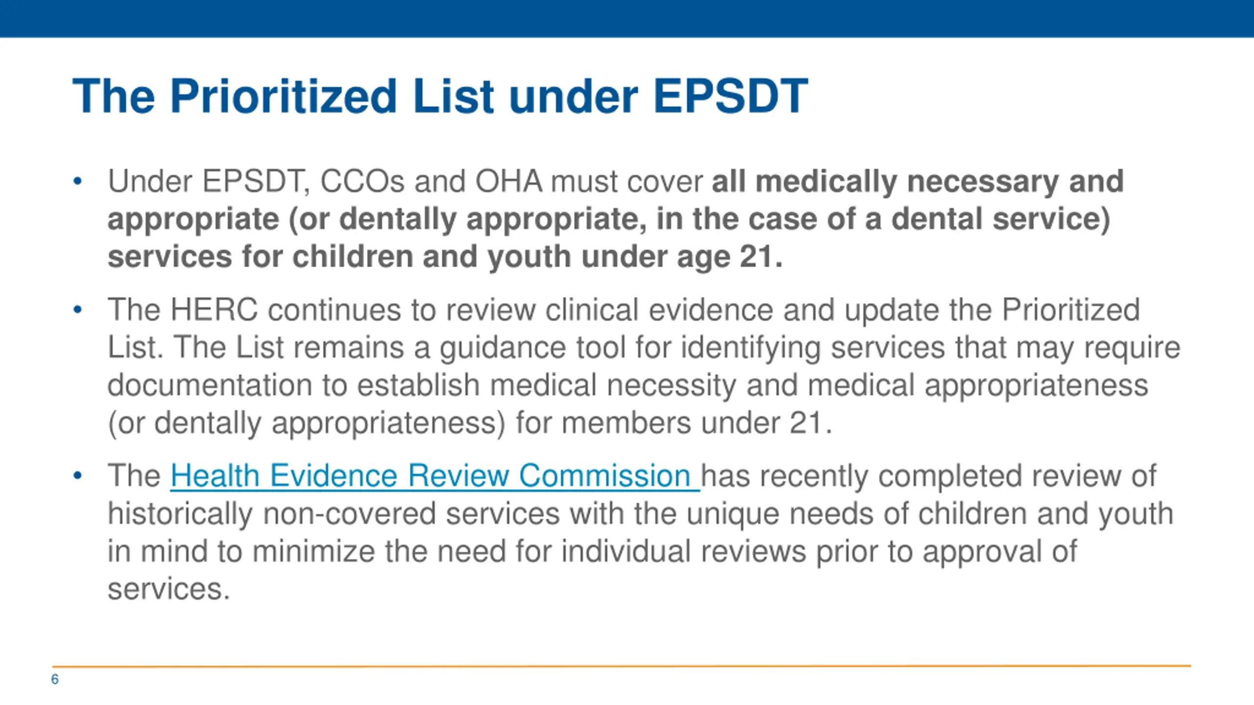 The Prioritized List under EPSDT Under EPSDT, CCOs and OHA must cover all medically necessary and appropriate (or dentally appropriate, in the case of a dental service) services for children and youth under age 21. The HERC continues to review clinical evidence and update the Prioritized List. The List remains a guidance tool for identifying services that may require documentation to establish medical necessity and medical appropriateness (or dentally appropriateness) for members under 21. The Health Evidence Review Commission has recently completed review of historically non-covered services with the unique needs of children and youth in mind to minimize the need for individual reviews prior to approval of services. 6