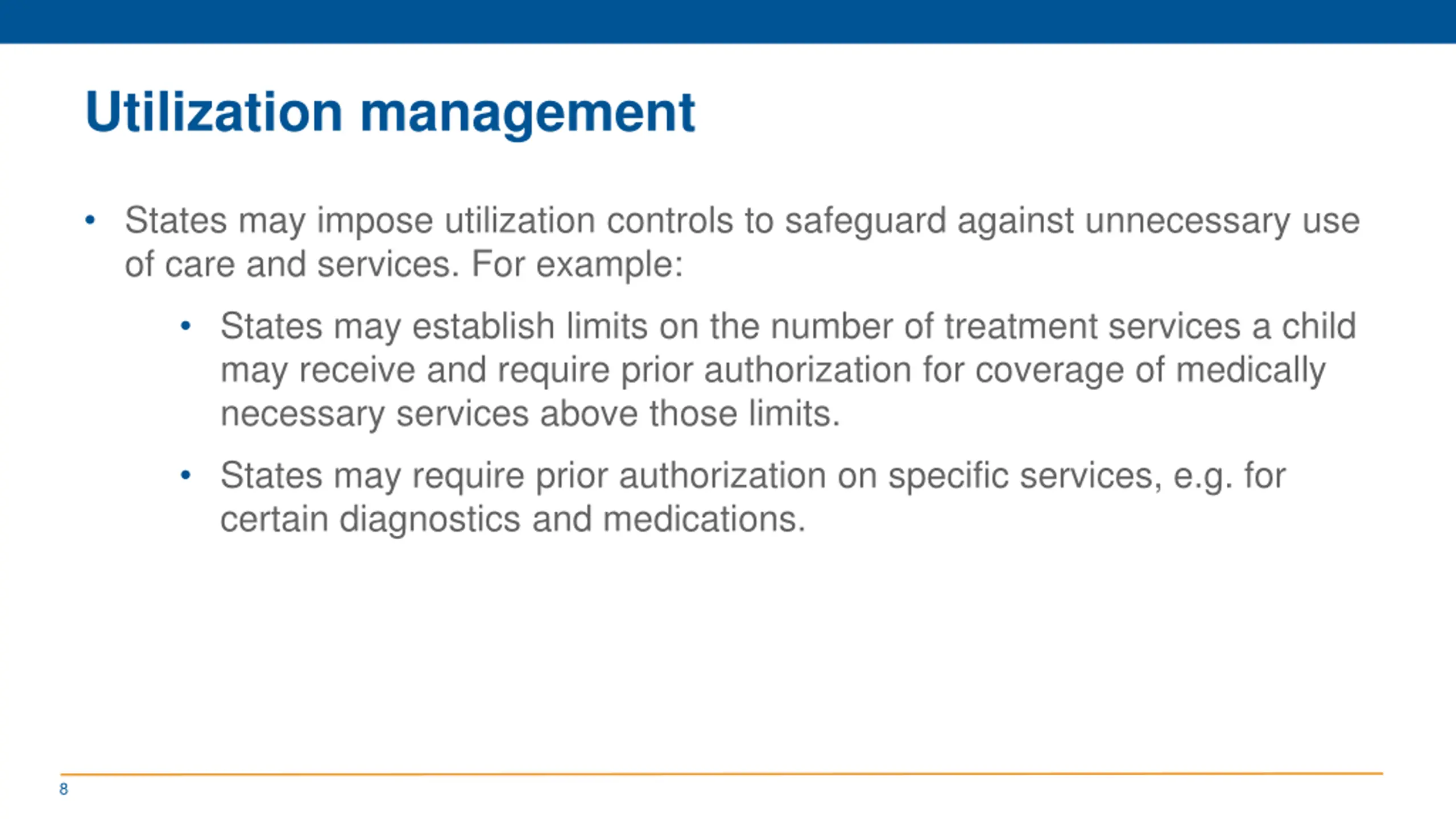Utilization management States may impose utilization controls to safeguard against unnecessary use of care and services. For example: States may establish limits on the number of treatment services a child may receive and require prior authorization for coverage of medically necessary services above those limits. States may require prior authorization on specific services, e.g. for certain diagnostics and medications. 8
