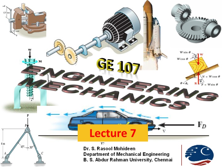 UNIT II EQUILIBRIUM OF RIGID BODIES SYLLABUS 2 Moments and Couples Moment of a force about a point and about an axis Vectorial representation of moments and couples Scalar components of a moment Varignon s theorem Free body diagram Types of supports and their reactions requirements of stable equilibrium Equilibrium of Rigid bodies in two dimensions Equilibrium of Rigid bodies in three dimensions Examples