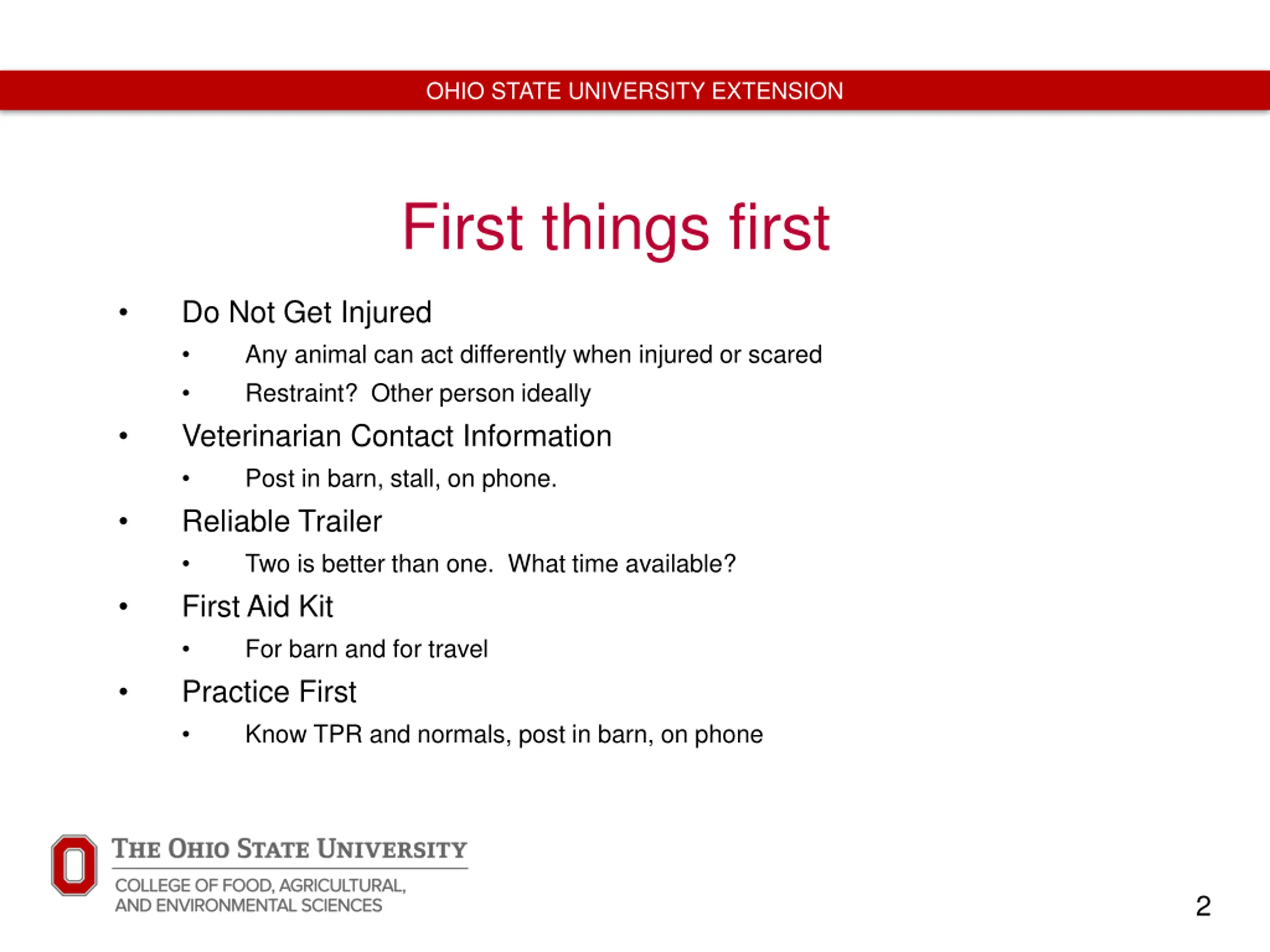 OHIO STATE UNIVERSITY EXTENSION First things first Do Not Get Injured Any animal can act differently when injured or scared Restraint? Other person ideally Veterinarian Contact Information Post in barn, stall, on phone. Reliable Trailer Two is better than one. What time available? First Aid Kit For barn and for travel Practice First Know TPR and normals, post in barn, on phone 2