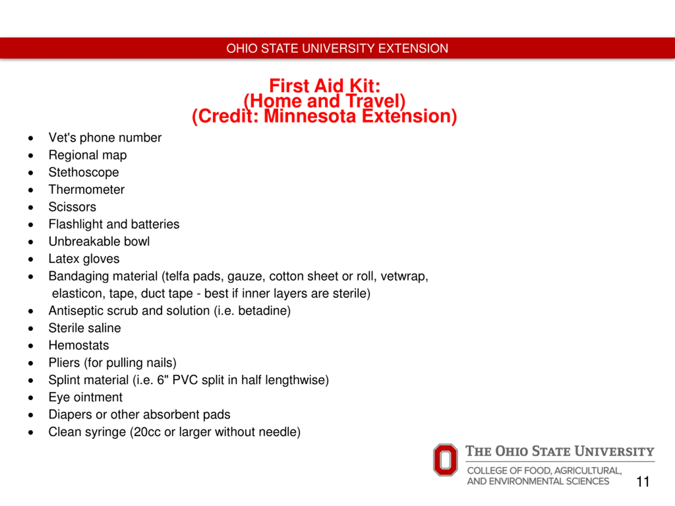 OHIO STATE UNIVERSITY EXTENSION First Aid Kit: (Home and Travel) (Credit: Minnesota Extension) Vet's phone number Regional map Stethoscope Thermometer Scissors Flashlight and batteries Unbreakable bowl Latex gloves Bandaging material (telfa pads, gauze, cotton sheet or roll, vetwrap, elasticon, tape, duct tape - best if inner layers are sterile) Antiseptic scrub and solution (i.e. betadine) Sterile saline Hemostats Pliers (for pulling nails) Splint material (i.e. 6" PVC split in half lengthwise) Eye ointment Diapers or other absorbent pads Clean syringe (20cc or larger without needle) 11