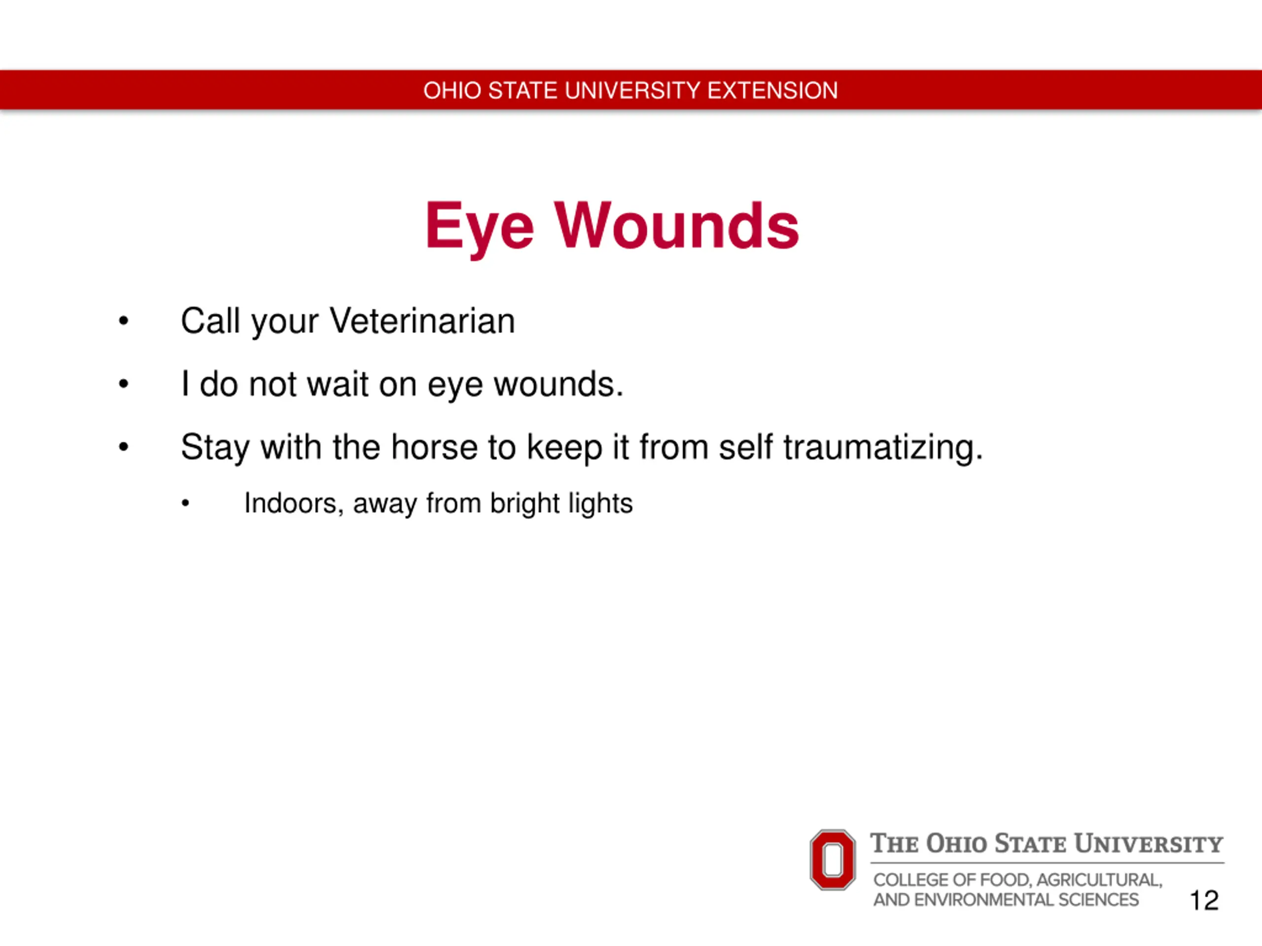 OHIO STATE UNIVERSITY EXTENSION Eye Wounds Call your Veterinarian I do not wait on eye wounds. Stay with the horse to keep it from self traumatizing. Indoors, away from bright lights 12