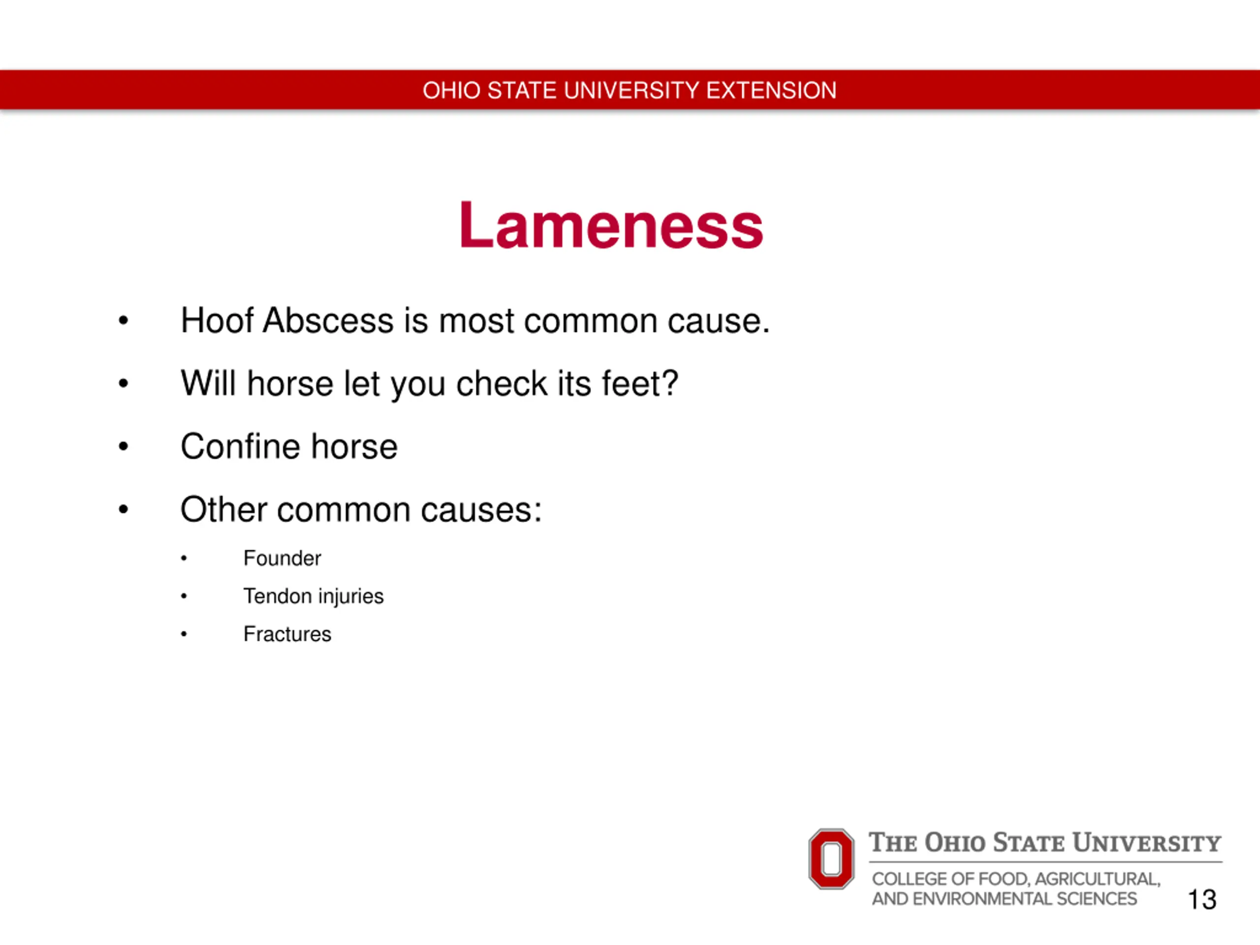 OHIO STATE UNIVERSITY EXTENSION Lameness Hoof Abscess is most common cause. Will horse let you check its feet? Confine horse Other common causes: Founder Tendon injuries Fractures 13