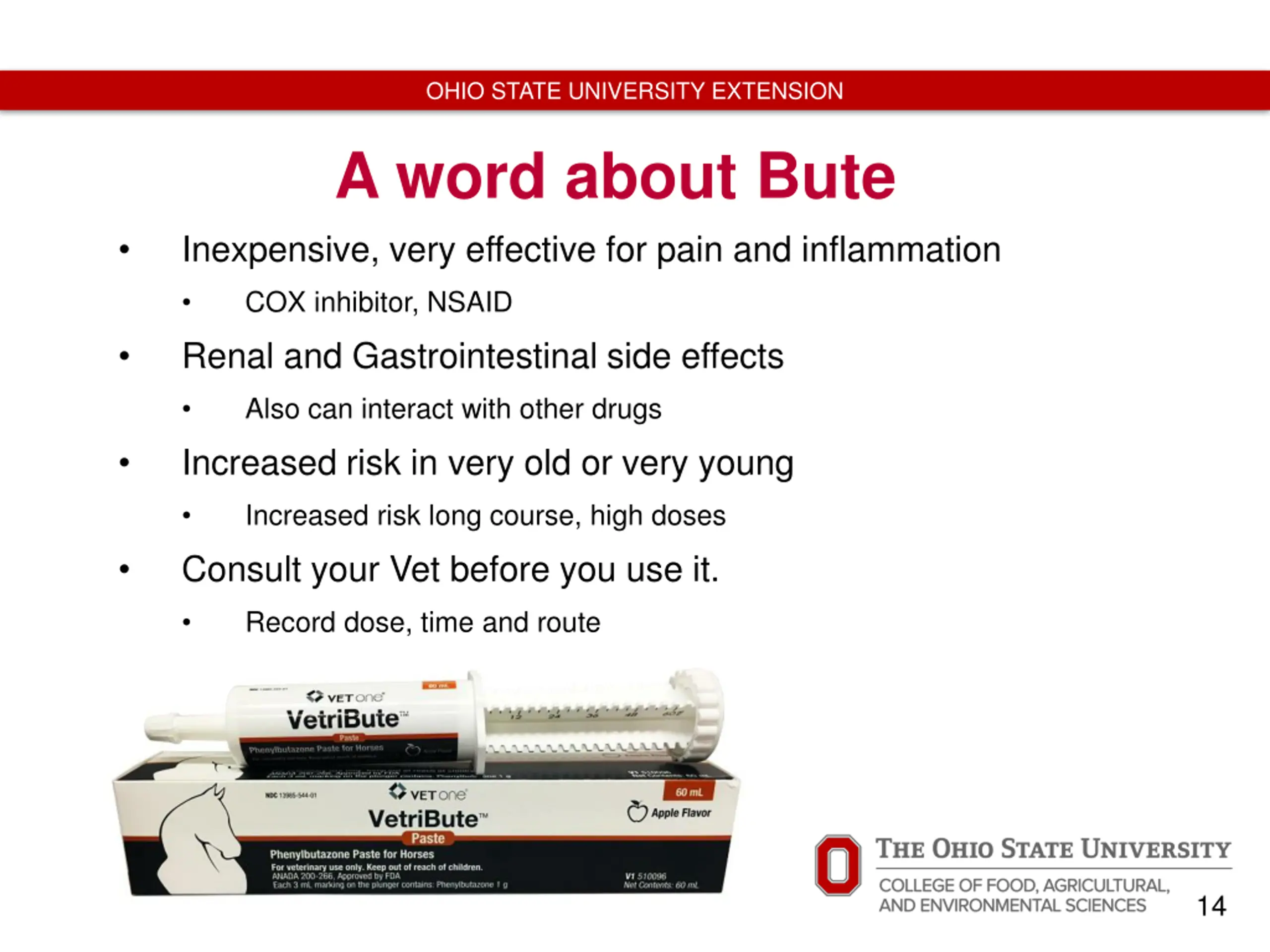 OHIO STATE UNIVERSITY EXTENSION A word about Bute Inexpensive, very effective for pain and inflammation COX inhibitor, NSAID Renal and Gastrointestinal side effects Also can interact with other drugs Increased risk in very old or very young Increased risk long course, high doses Consult your Vet before you use it. Record dose, time and route http://www.allivet.com/images/product/large/3416.jpg For barn and for travel 14