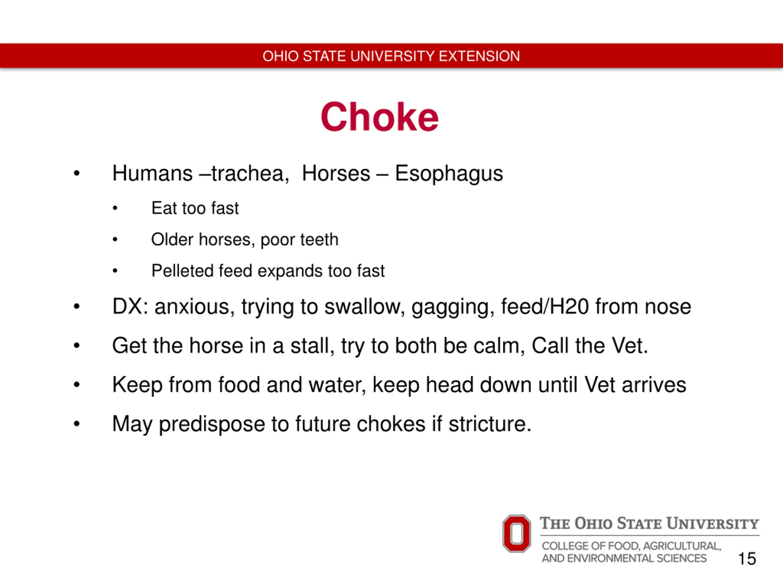 OHIO STATE UNIVERSITY EXTENSION Choke Humans trachea, Horses Esophagus Eat too fast Older horses, poor teeth Pelleted feed expands too fast DX: anxious, trying to swallow, gagging, feed/H20 from nose Get the horse in a stall, try to both be calm, Call the Vet. Keep from food and water, keep head down until Vet arrives May predispose to future chokes if stricture. 15