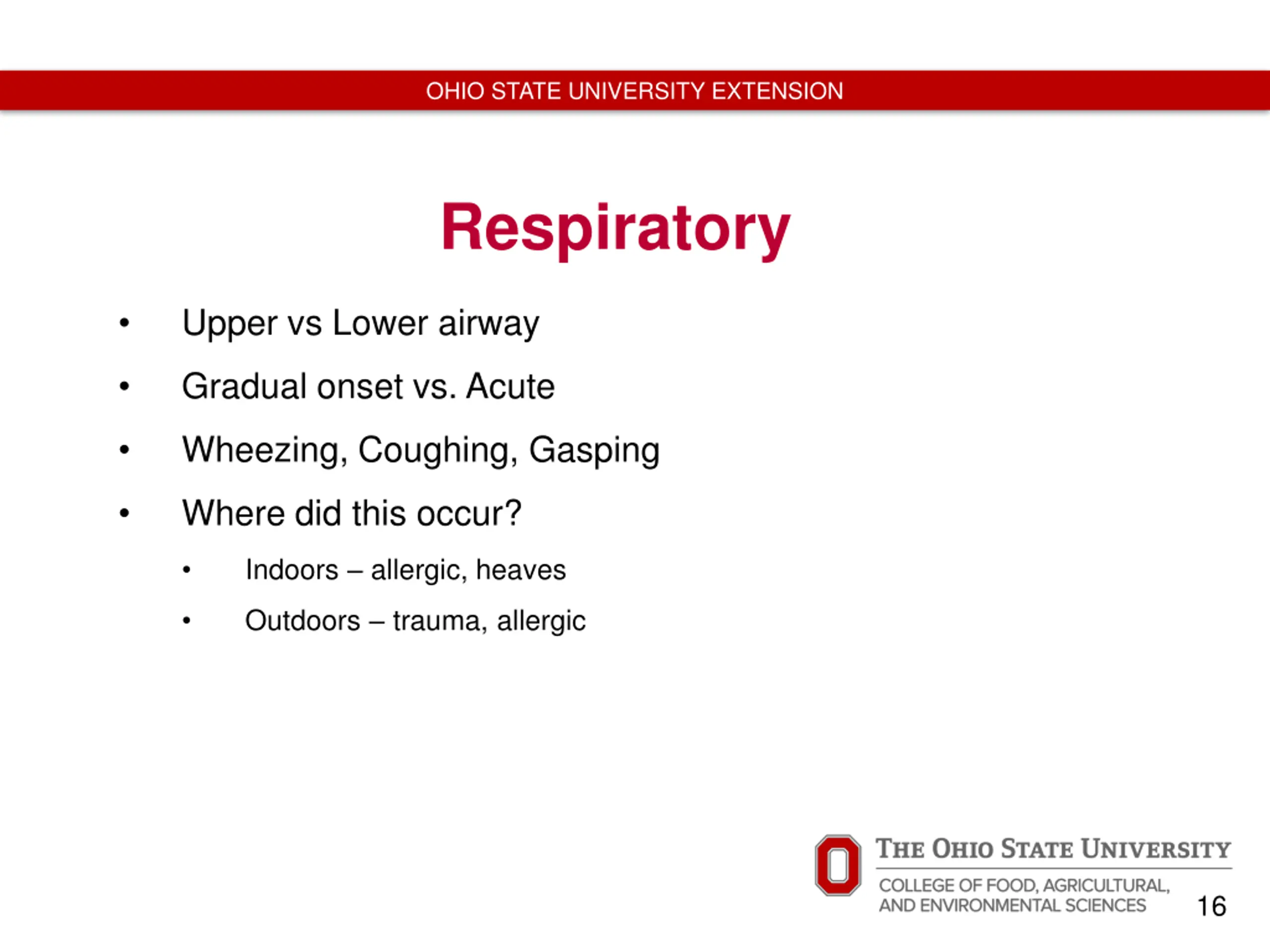 OHIO STATE UNIVERSITY EXTENSION Respiratory Upper vs Lower airway Gradual onset vs. Acute Wheezing, Coughing, Gasping Where did this occur? Indoors allergic, heaves Outdoors trauma, allergic 16
