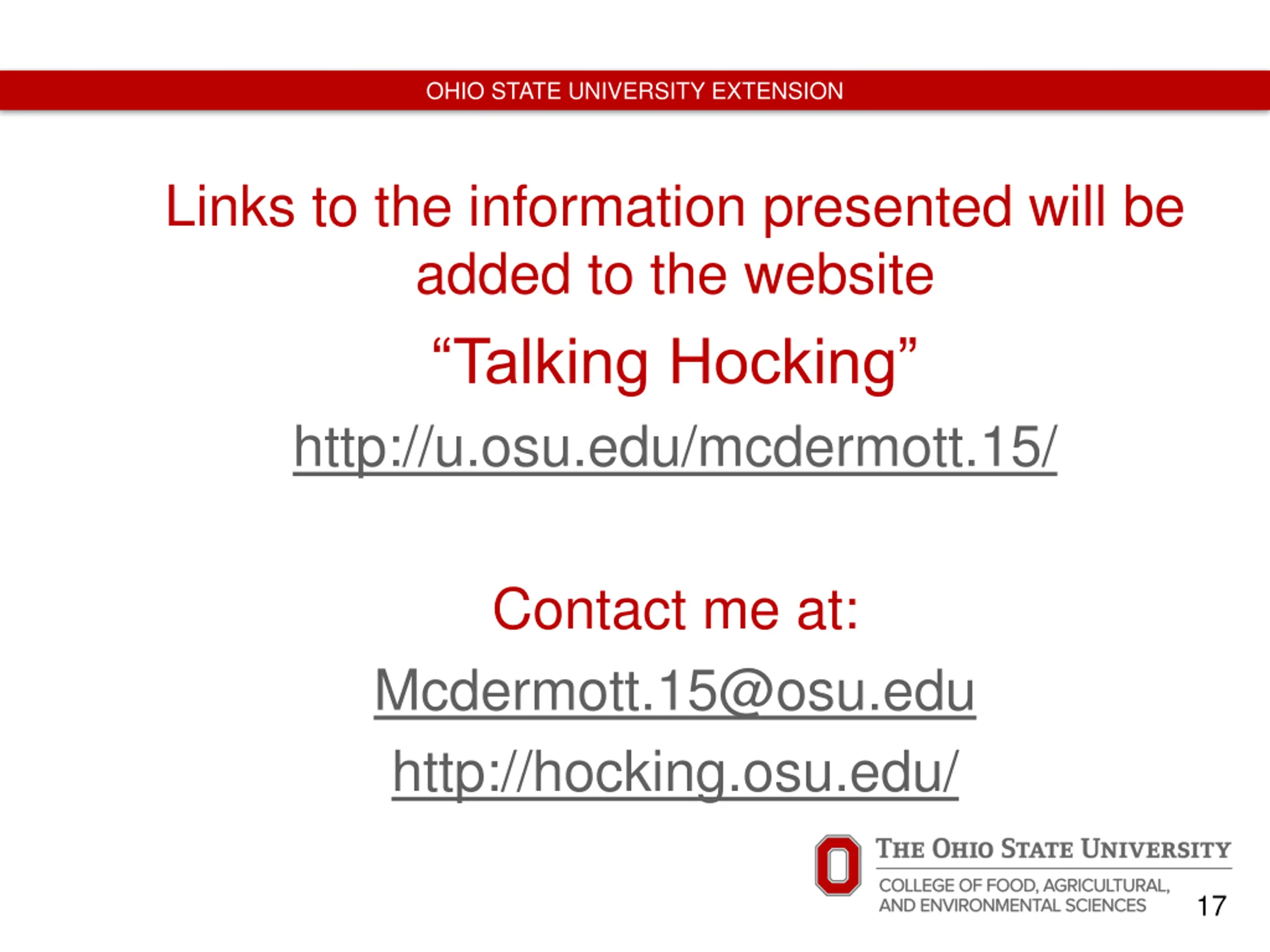 OHIO STATE UNIVERSITY EXTENSION Links to the information presented will be added to the website Talking Hocking http://u.osu.edu/mcdermott.15/ Contact me at: Mcdermott.15@osu.edu http://hocking.osu.edu/ 17