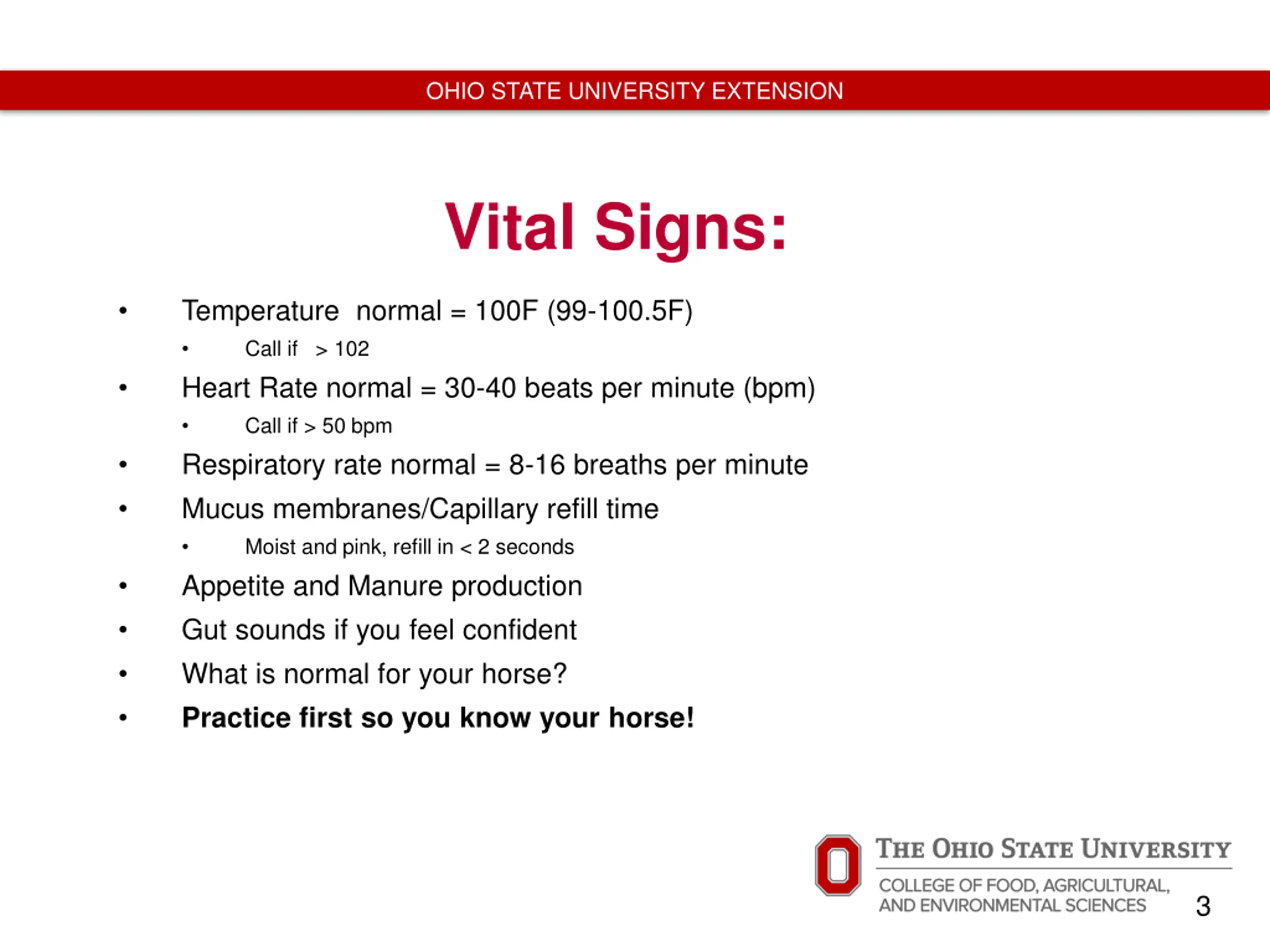 OHIO STATE UNIVERSITY EXTENSION Vital Signs: Temperature normal = 100F (99-100.5F) Call if > 102 Heart Rate normal = 30-40 beats per minute (bpm) Call if > 50 bpm Respiratory rate normal = 8-16 breaths per minute Mucus membranes/Capillary refill time Moist and pink, refill in < 2 seconds Appetite and Manure production Gut sounds if you feel confident What is normal for your horse? Practice first so you know your horse! 3