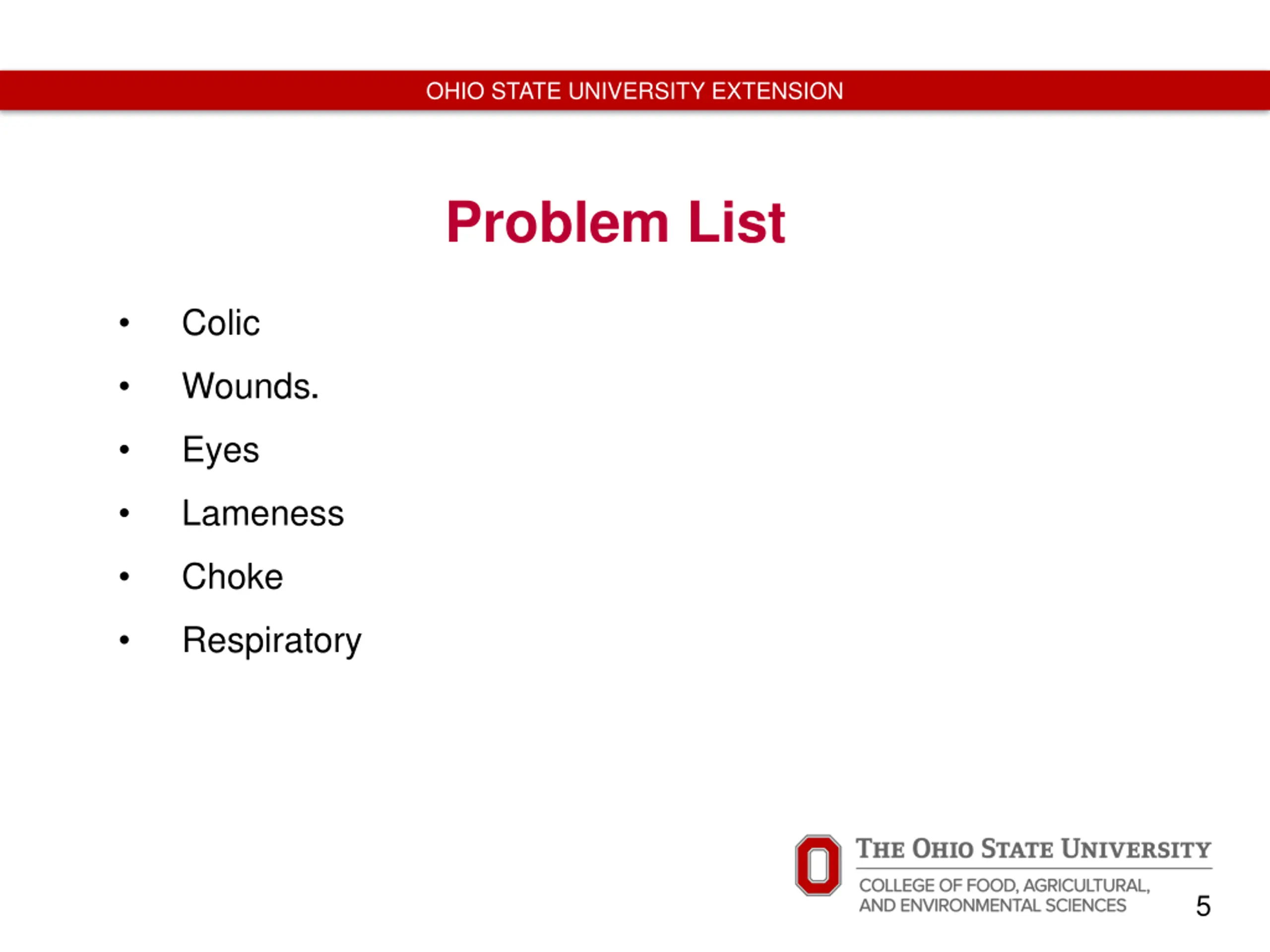OHIO STATE UNIVERSITY EXTENSION Problem List Colic Wounds. Eyes Lameness Choke Respiratory 5