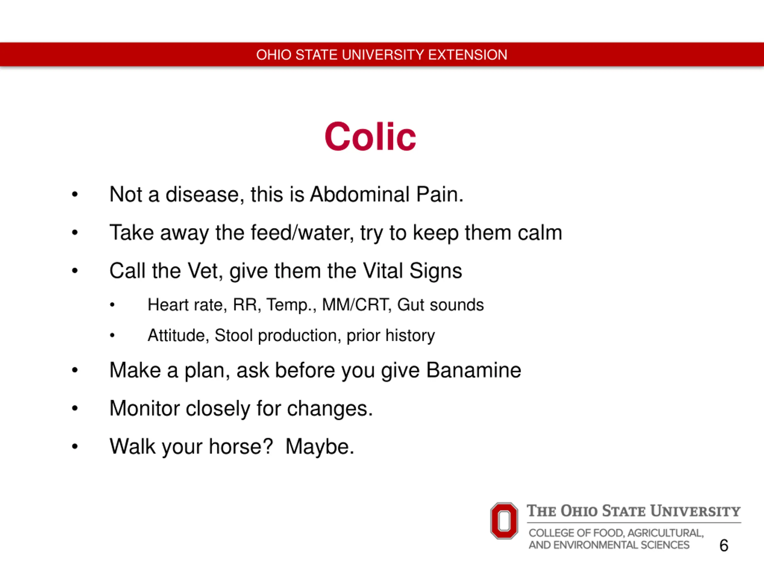 OHIO STATE UNIVERSITY EXTENSION Colic Not a disease, this is Abdominal Pain. Take away the feed/water, try to keep them calm Call the Vet, give them the Vital Signs Heart rate, RR, Temp., MM/CRT, Gut sounds Attitude, Stool production, prior history Make a plan, ask before you give Banamine Monitor closely for changes. Walk your horse? Maybe. 6